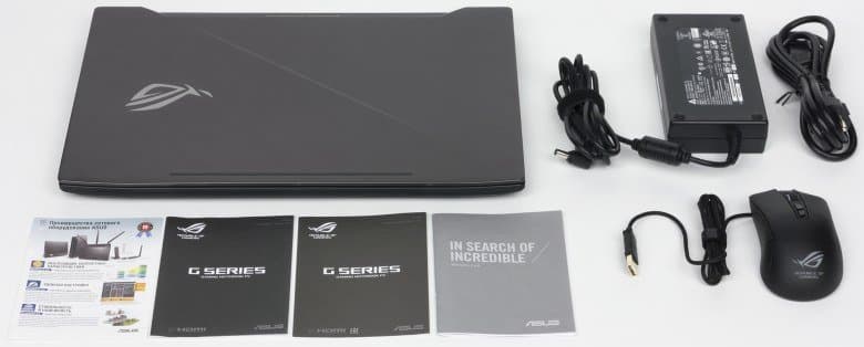 Кроме самого ноутбука в комплект поставки входит краткое руководство пользователя, гарантийный талон, адаптер питания мощностью 230 Вт (19,5 В; 11,8 A) и даже игровая мышка серии Asus ROG.
