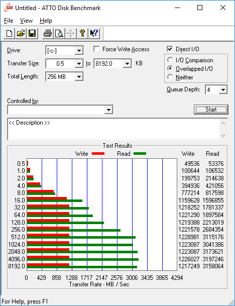Утилита ATTO Disk Benchmark определяет его максимальную скорость последовательного чтения на уровне 3,1 ГБ/с, а скорость последовательной записи — на уровне 1,2 ГБ/с. Это очень высокий результат для одиночного накопителя.