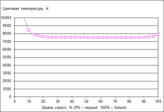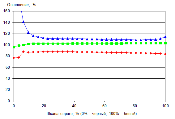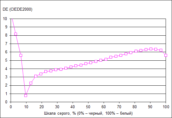 Что касается точности цветопередачи (дельта Е), то ее значение не превосходит 7 по всей шкале серого (темные области можно не учитывать), что является неплохим результатом для данного класса экранов.