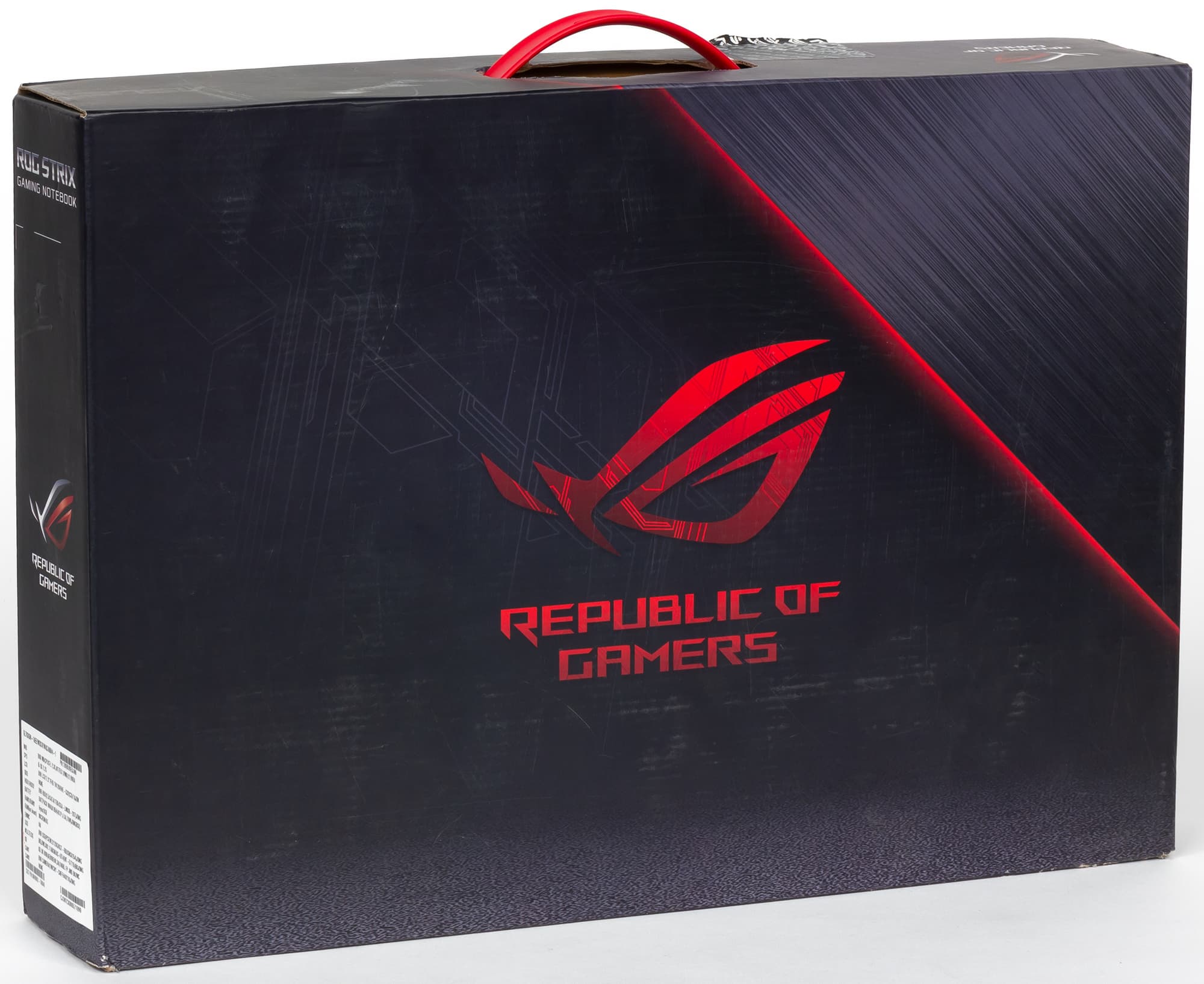 Ноутбук Asus ROG Strix GL703GM поставляется в небольшой картонной коробке черного цвета с ручкой.
