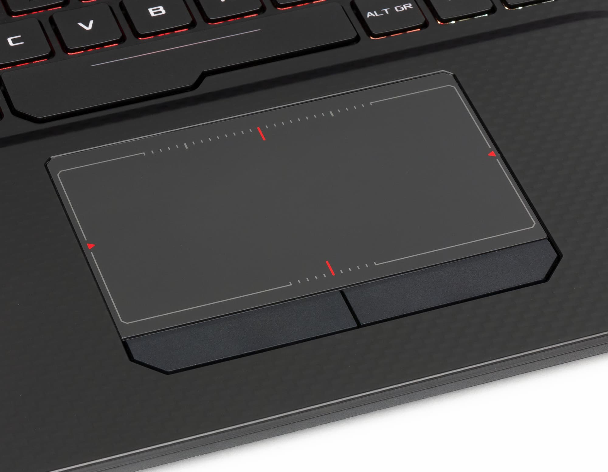 В ноутбуке Asus ROG Strix GL703GM используется классический тачпад с двумя кнопками. Размеры его сенсорной поверхности составляют 108×64 мм. Сенсорная поверхность тачпада немного заглублена. Работать с ним очень удобно.