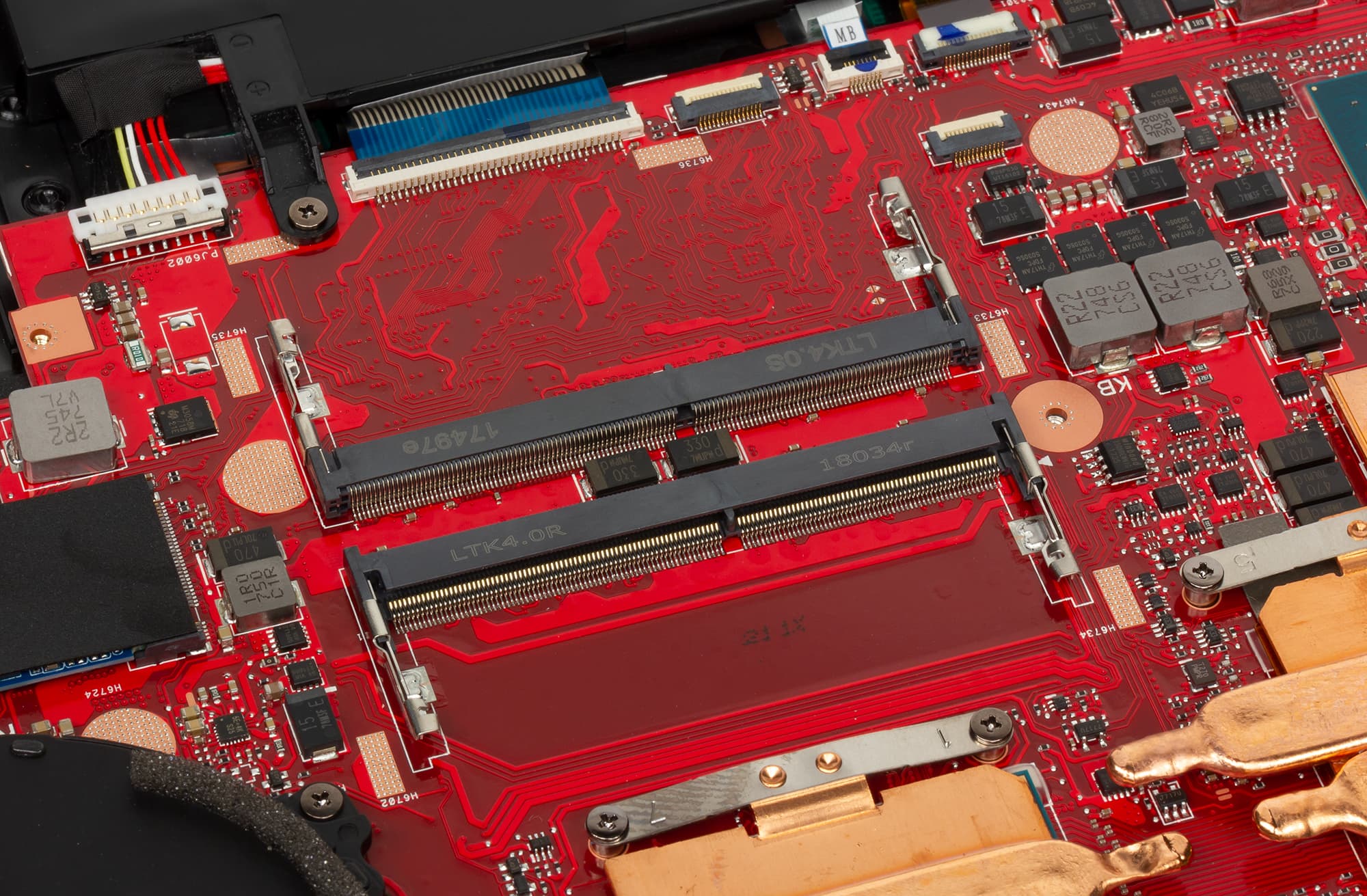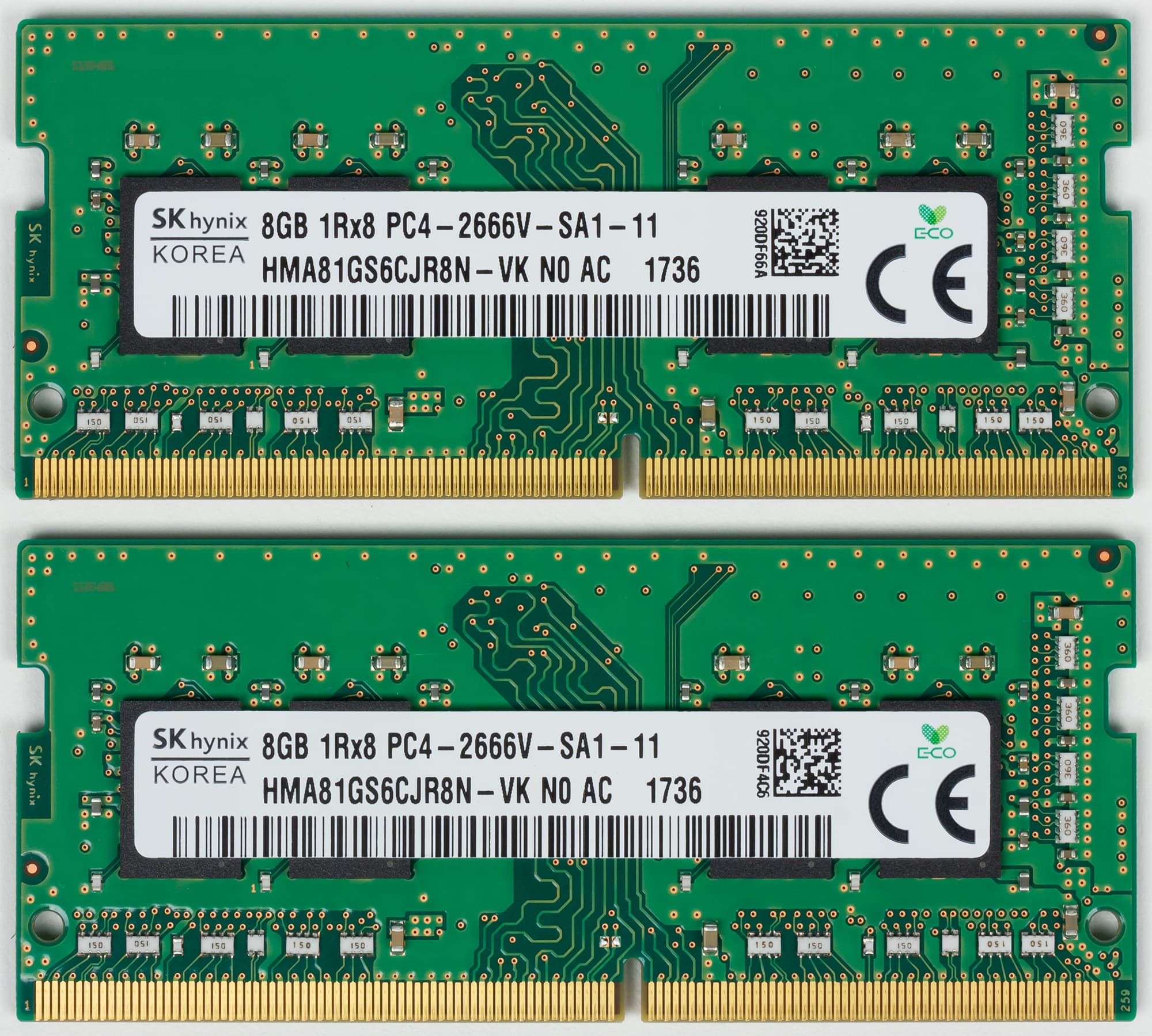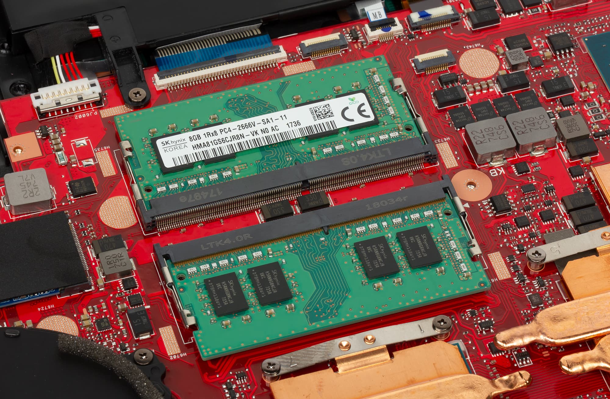 В нашем случае в ноутбуке были установлены два модуля памяти DDR4-2666 емкостью по 8 ГБ (SK Hynix HMA81GS6CJR8N-VK). Максимальный объем памяти, поддерживаемый ноутбуком, составляет 32 ГБ.