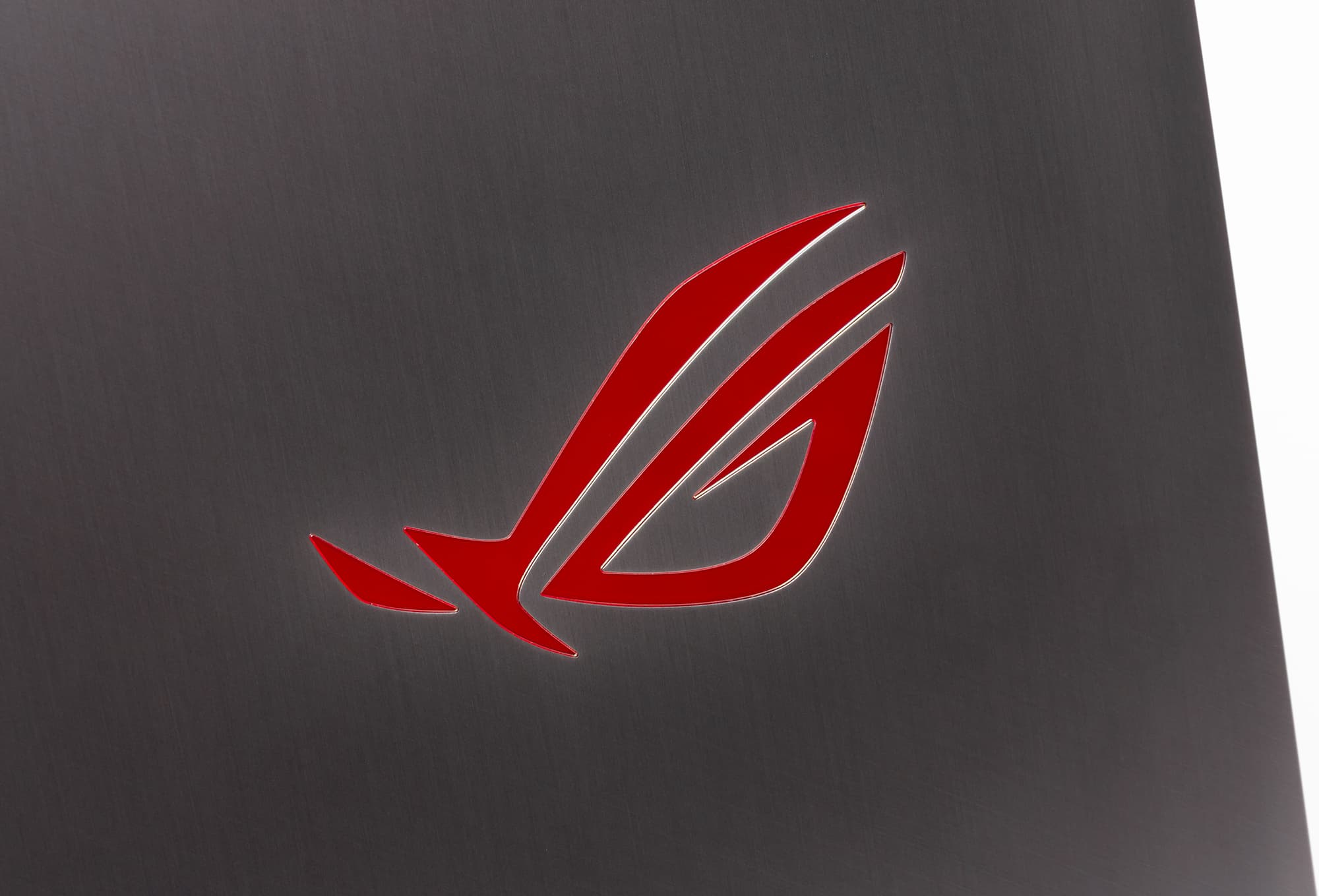 На крышке красуется эмблема игровой серии ROG зеркального цвета, которая подсвечивается красным цветом при включении ноутбука.
