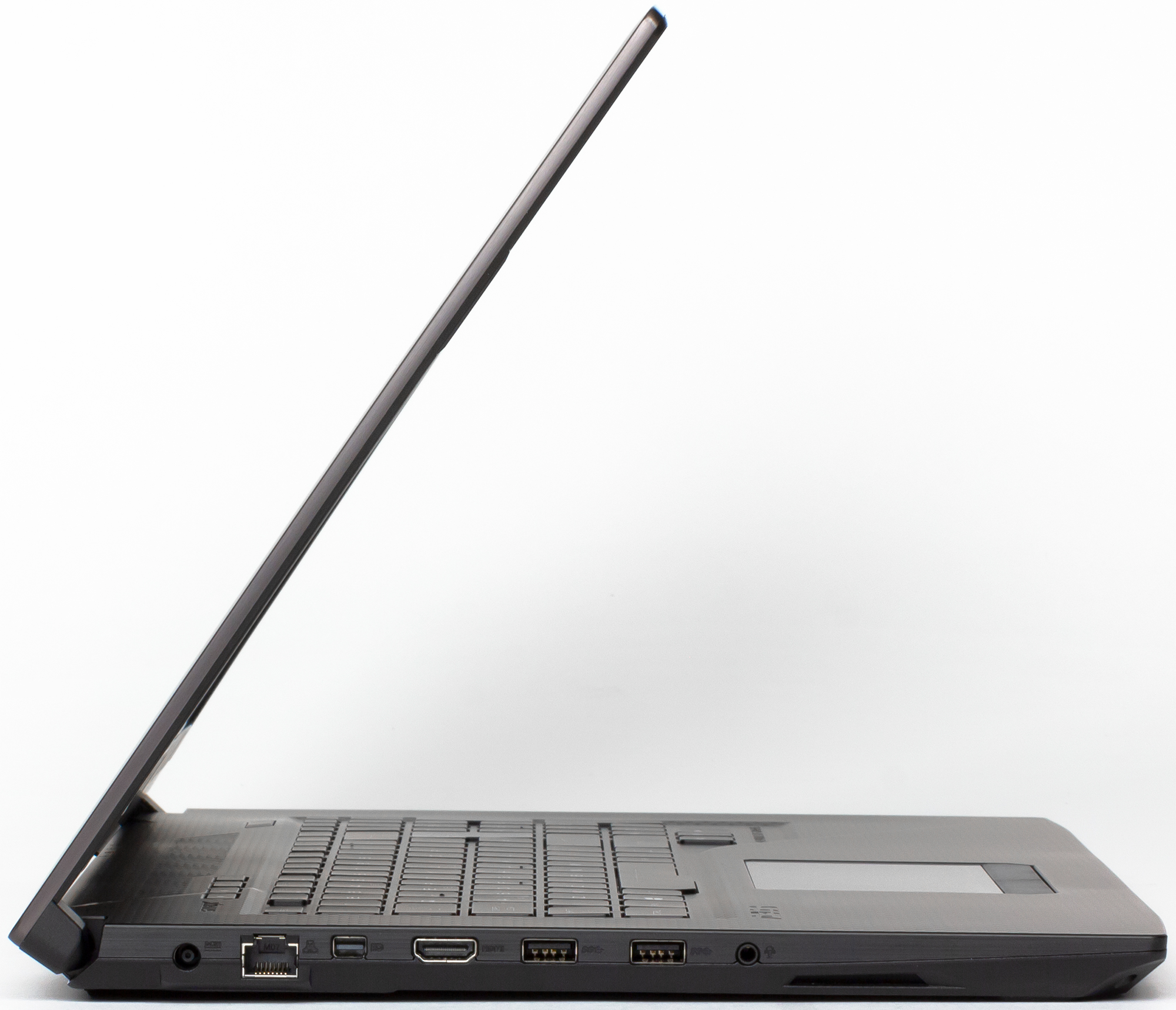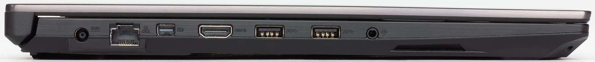 На левом торце корпуса расположены два порта USB 3.0 (Type-A), разъем HDMI, разъем Mini-DisplayPort, разъем RJ-45 и комбинированный аудиоразъем типа миниджек. Кроме того, тут же расположен разъем питания.