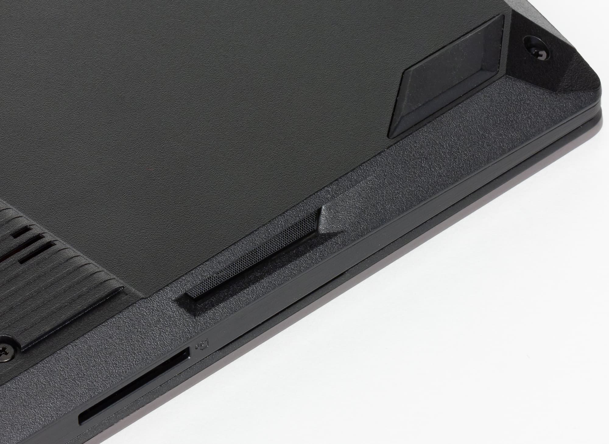 На нижней панели корпуса есть вентиляционные отверстия. Прорезиненные ножки обеспечивают устойчивое положение ноутбука на горизонтальной поверхности.