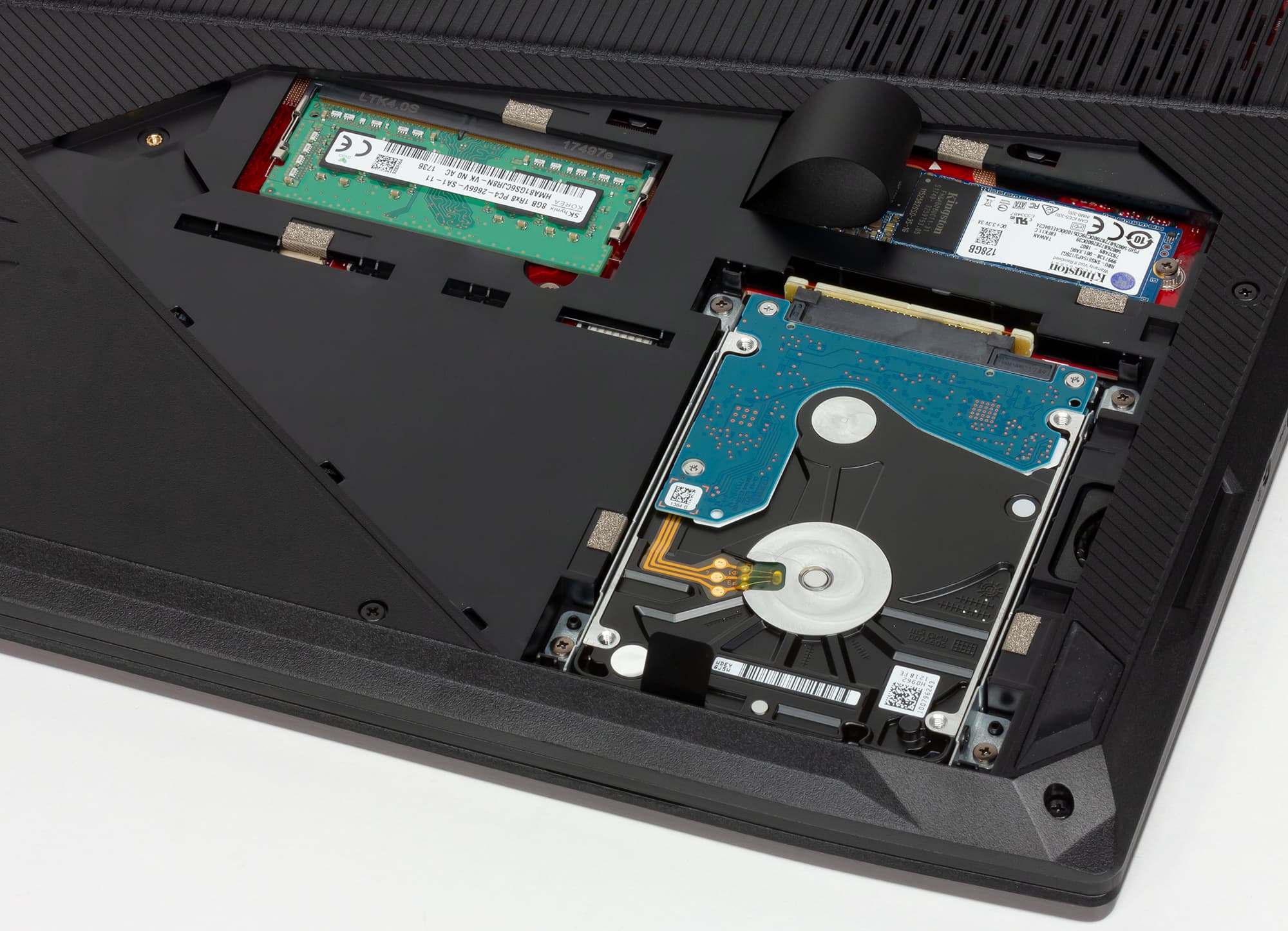 На нижней панели ноутбука Asus ROG Strix GL703GM имеется лючок в форме скошенного шестиугольника. Сняв его, можно получить доступ к HDD, SSD и одному слоту памяти.