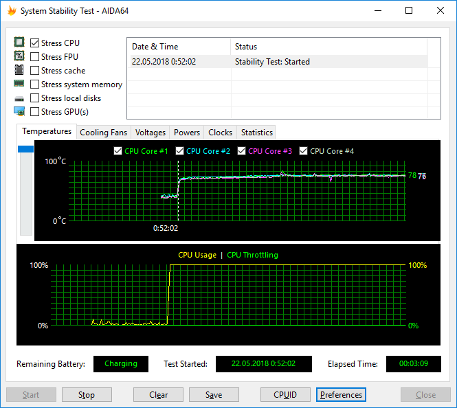 Температура ядер процессора при этом достигает 78 °C, а мощность энергопотребления процессора — 38 Вт.