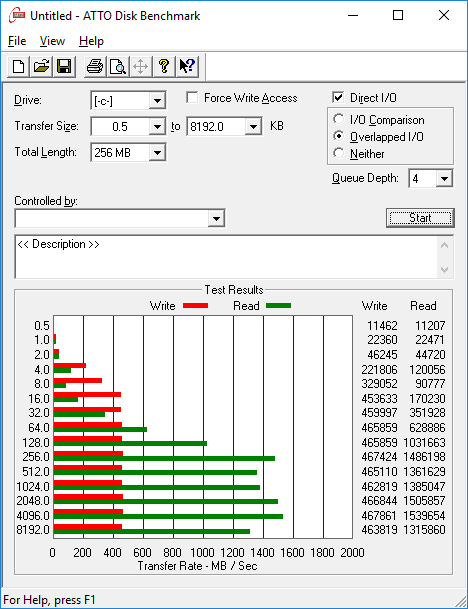 Утилита ATTO Disk Benchmark определяет его максимальную скорость последовательного чтения на уровне 1500 МБ/с, а скорость последовательной записи — на уровне 460 МБ/с. К скорости чтения вопросов нет, а вот скорость записи для SSD накопителя с интерфейсом PCIe 3.0 x4 очень низкая.