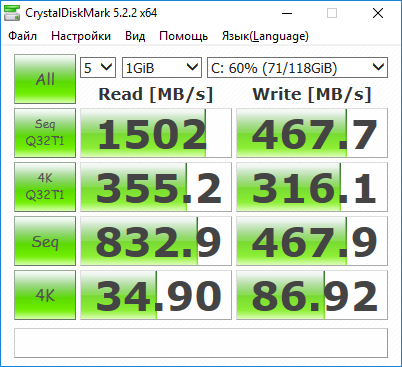 Утилитам CrystalDiskMark демонстрирует аналогичный результат.