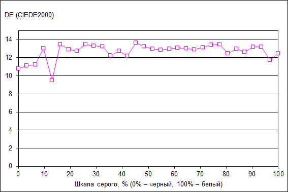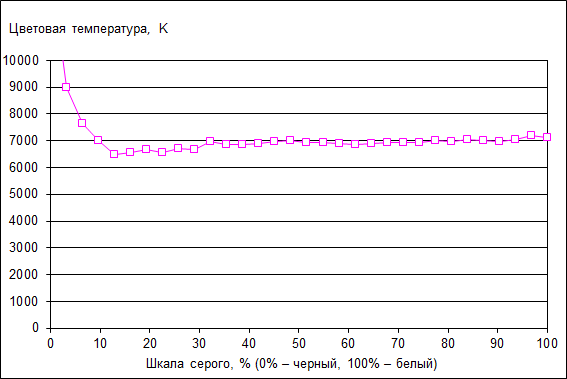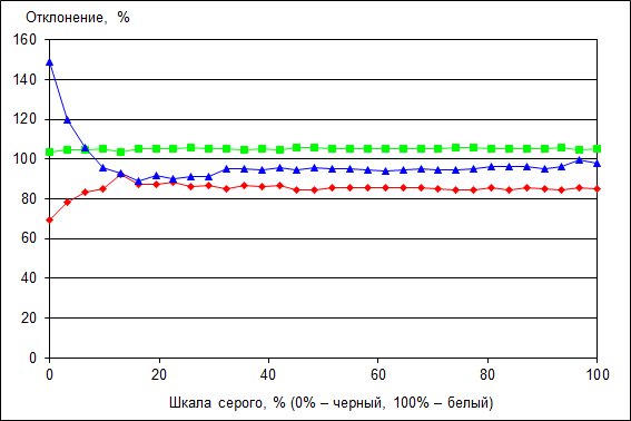 Стабильность цветовой температуры объясняется тем, что основные цвета стабильны по всей шкале серого. Однако, стоит отметить, что уровень красного немного занижен.