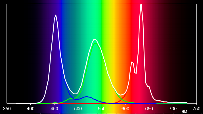 Светофильтры ЖК-матрицы очень хорошо выделяют спектры основных цветов. Спектры основных цветов не перекрываются и очень четко выделены.