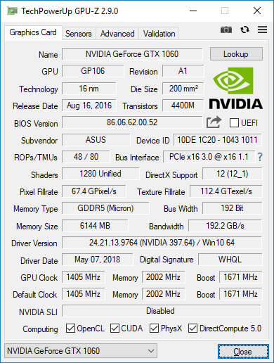 В этот процессор интегрировано графическое ядро Intel HD Graphics 630, однако в варианте ноутбука Asus GL703GM использовать его не получится. Ноутбук оснащен видеокартой Nvidia GeForce GTX 1060 с 6 ГБ видеопамяти GDDR5, причем технология Nvidia Optimus не поддерживается, так что можно использовать только видеокарту Nvidia.