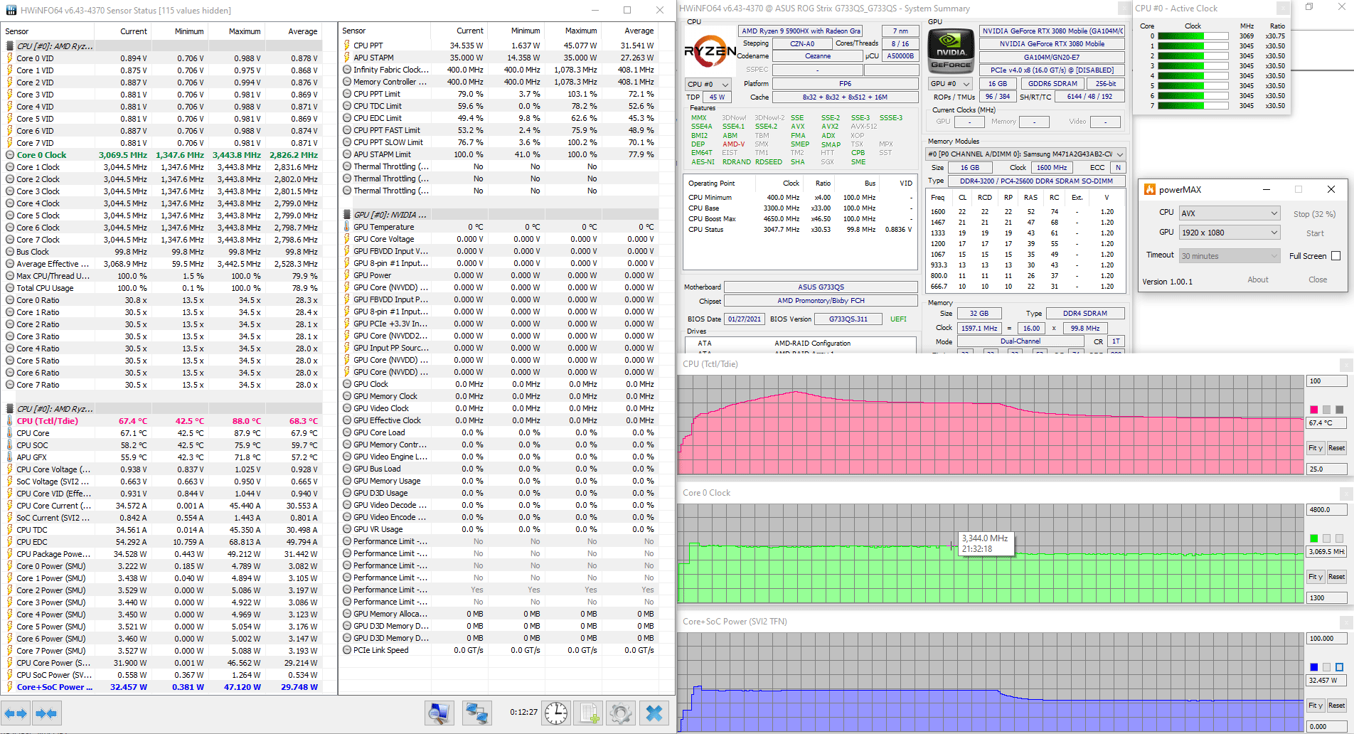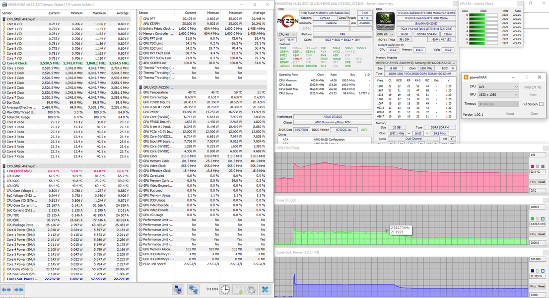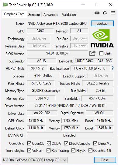 | Видеоподсистема | интегрированная графика AMD Radeon Graphics; Nvidia GeForce RTX 3080 Laptop 16 ГБ до 1645 МГц (ROG Boost — 115 Вт, Dynamic Boost — 130 Вт) | |