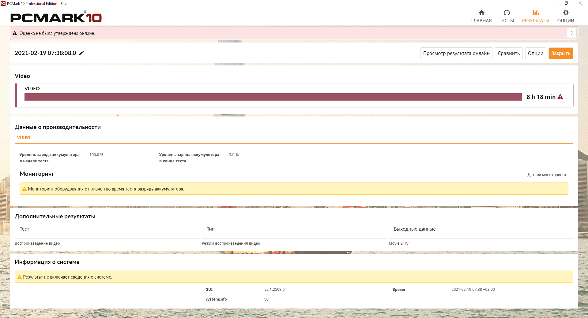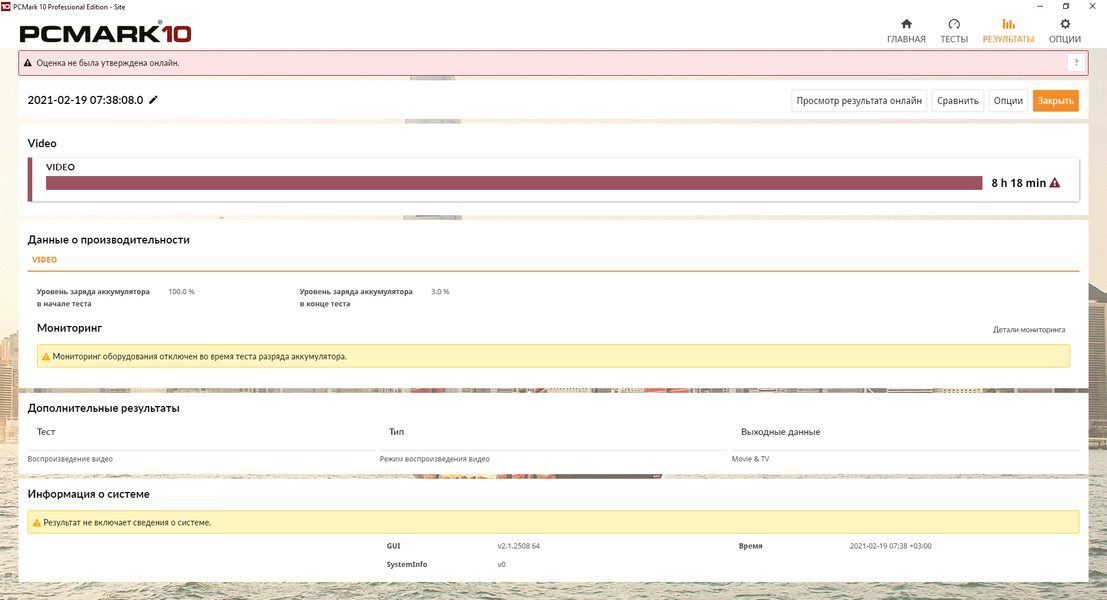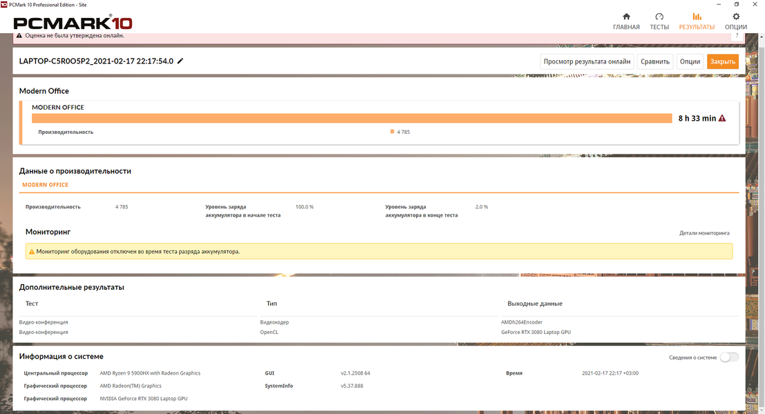 В тестах автономности Asus ROG Strix Scar 17 G733, проведенных с помощью тестового пакета PCMark’10, яркость экрана фиксировалась на уровне 100 кд/м² (что в данном случае эквивалентно 40%), как и на всех остальных ноутбуках, протестированных нами ранее, а сетевые соединения и звук не отключались. Несмотря на явную игровую направленность ноутбука, 17-дюймовый дисплей и производительные комплектующие, новая модель Asus смогла нас впечатлить и приличным временем автономной работы. Так, например, в эмуляции повседневной работы (Modern Office) со 100% до полного отключения ноутбук проработал 8 часов и 33 минуты, а при воспроизведении видеоконтента — 8 часов и 18 минут.