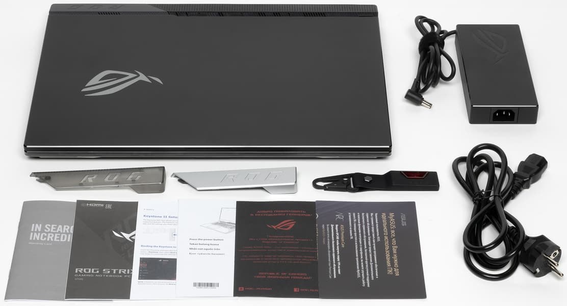 Asus ROG Strix Scar 17 G733 комплектуется адаптером питания ADP-240EB мощностью 240 Вт (20 В, 12,0 А) массой 730 граммов и встроенным кабелем длиной 1,28 м.