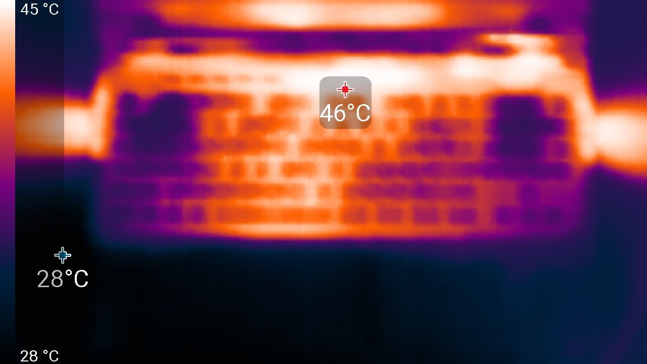 Под максимальной нагрузкой работать с клавиатурой комфортно, так как места под запястьями не нагреваются. Держать ноутбук на коленях при этом неприятно, так как колени частично соприкасаются с областями высокого нагрева. Колени также могут перекрыть заборные вентиляционные решетки (чего не происходит при размещении ноутбука на ровной твердой поверхности), это может вызвать перегрев ноутбука. Несмотря на всяческие предохранительные меры, перегрев все равно может привести к неприятным последствиям. Блок питания греется очень сильно (хотя потребление от розетки не такое уж большое), поэтому при долговременной работе с высокой производительностью обязательно нужно следить, чтобы он не был ничем накрыт.
