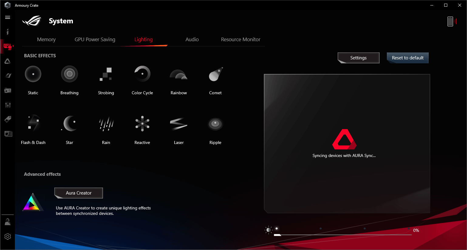 Для ее настройки в Asus ROG Armoury Crate предусмотрен соответствующий раздел с 12 предустановленными эффектами.