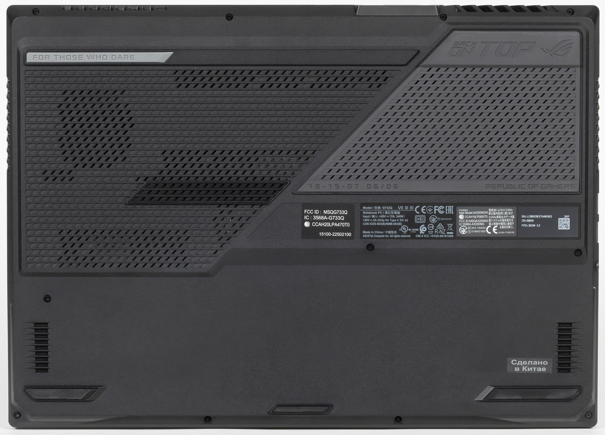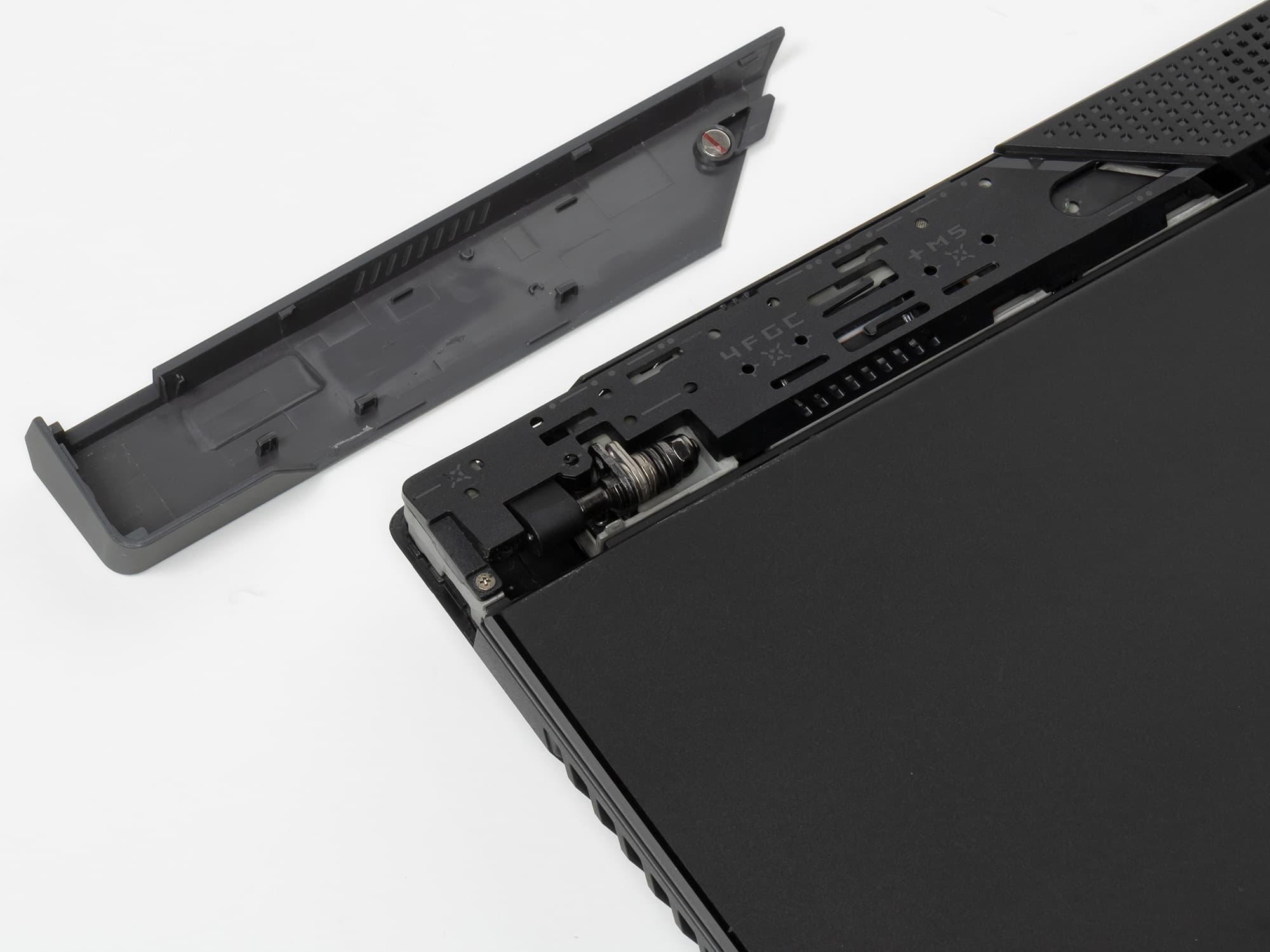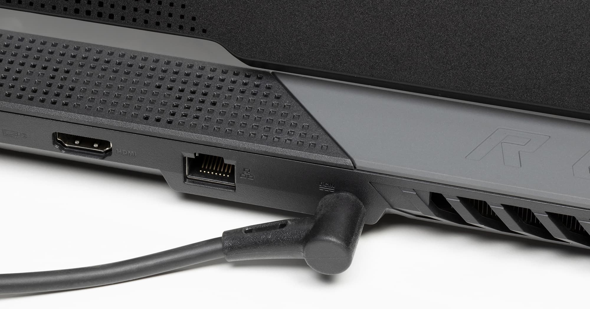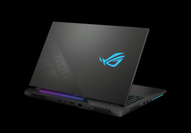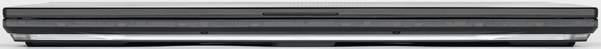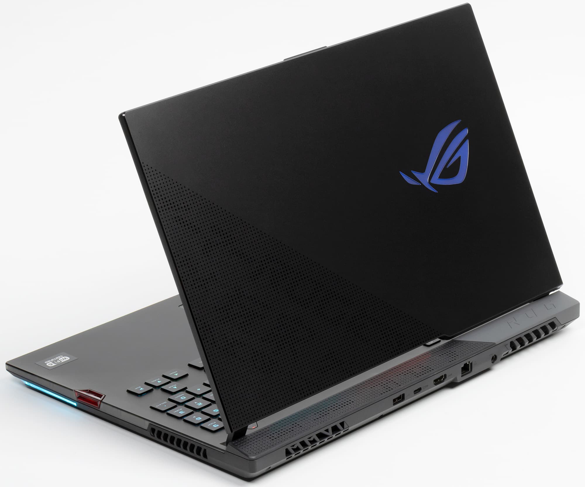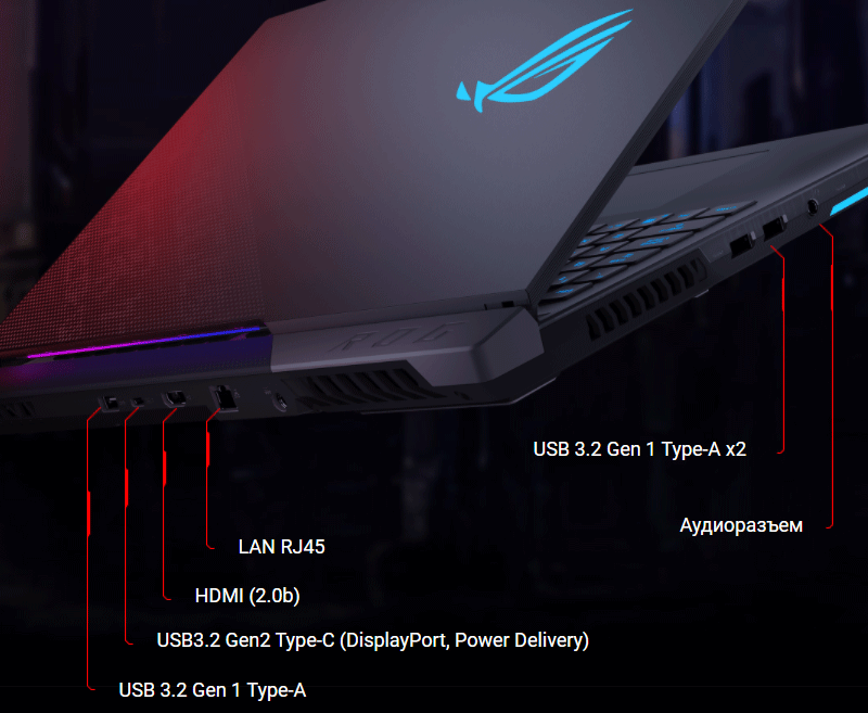 Игровой статус ноутбука подчеркивает и сияющий металлом логотип ROG на верхней крышке, соседствующий с декором из иллюминационной перфорации, плавно переходящей с нижней части корпуса.