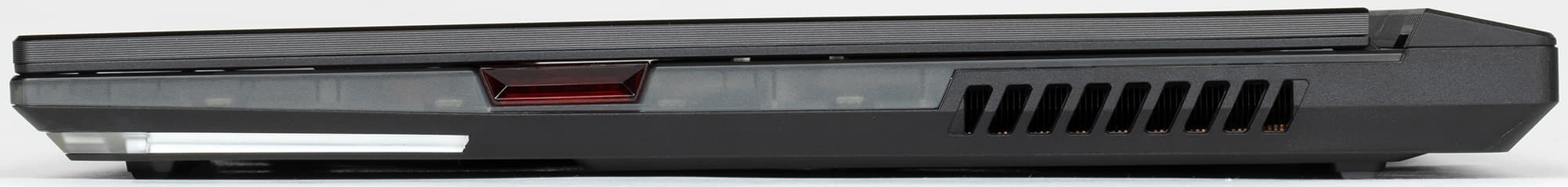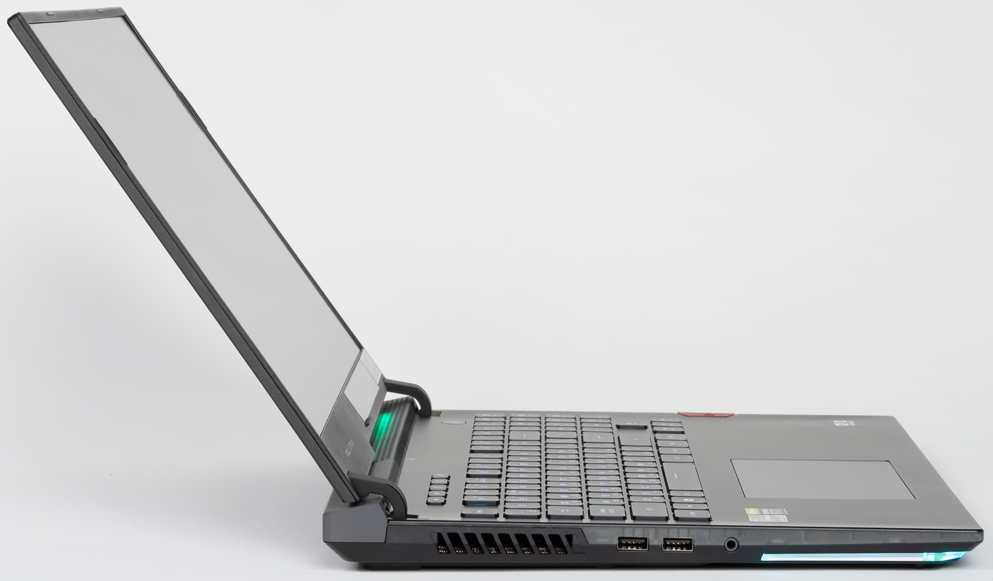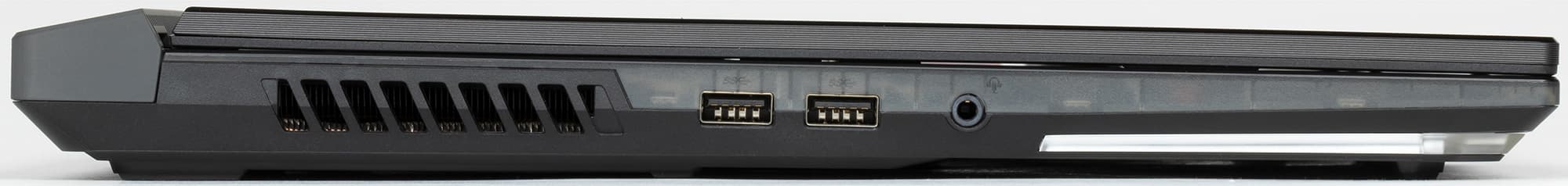 При взгляде сбоку нельзя не отметить акцентированный наклон корпуса вперед (как у болида Формулы 1). На боковинах размещены два порта USB 3.2 Gen1 Type-A, комбинированный разъем для наушников и микрофона, а также порт NFC-ключа Keystone II.