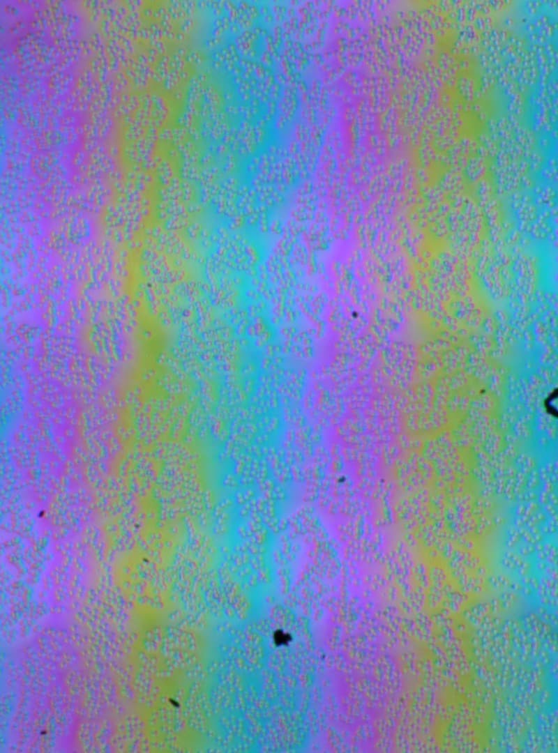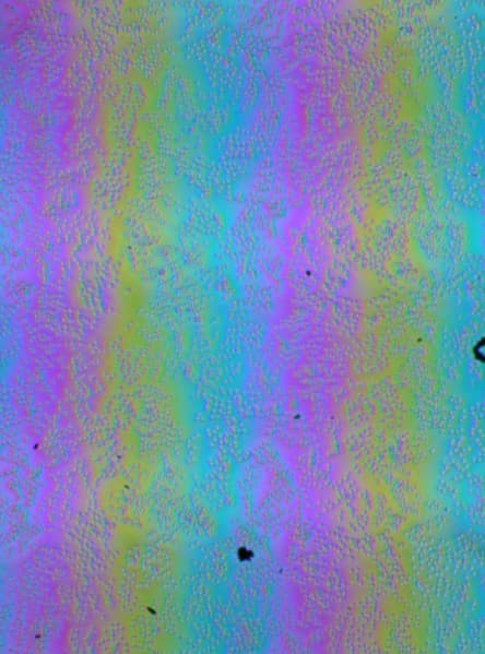 Зерно этих дефектов в несколько раз меньше размеров субпикселей (масштаб этих двух фотографий примерно одинаковый), поэтому фокусировка на микродефектах и «перескок» фокуса по субпикселям при изменении угла зрения выражены слабо, из-за этого нет и «кристаллического» эффекта.