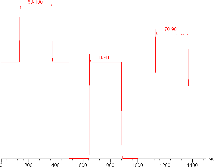 На любом уровне яркости значимая модуляция подсветки отсутствует, поэтому нет и никакого мерцания экрана. В доказательство приведем графики зависимости яркости (вертикальная ось) от времени (горизонтальная ось) при различных значениях настройки яркости:
