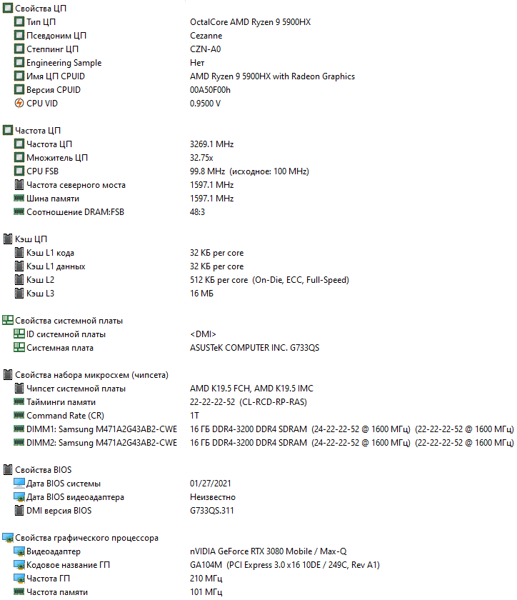 | Процессор | AMD Ryzen 9 5900HX (7 нм FinFET, 8 ядер/16 потоков, 3,3—4,6 ГГц, L3-кэш 16 МБ, TDP 35—54 Вт) | |