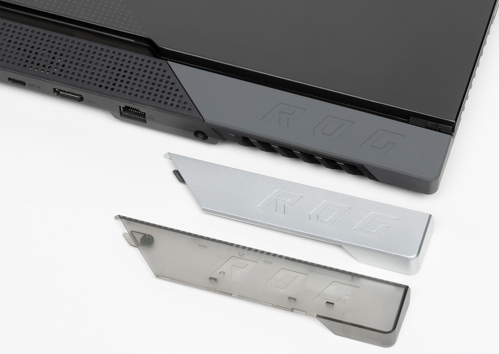 Эксклюзивной фишкой Asus ROG Strix Scar 17 G733 являются сменные накладки Armor Caps, подчеркивающие индивидуальность устройства, но, вопреки нашим ожиданиям, в этой части корпуса подсветки нет.