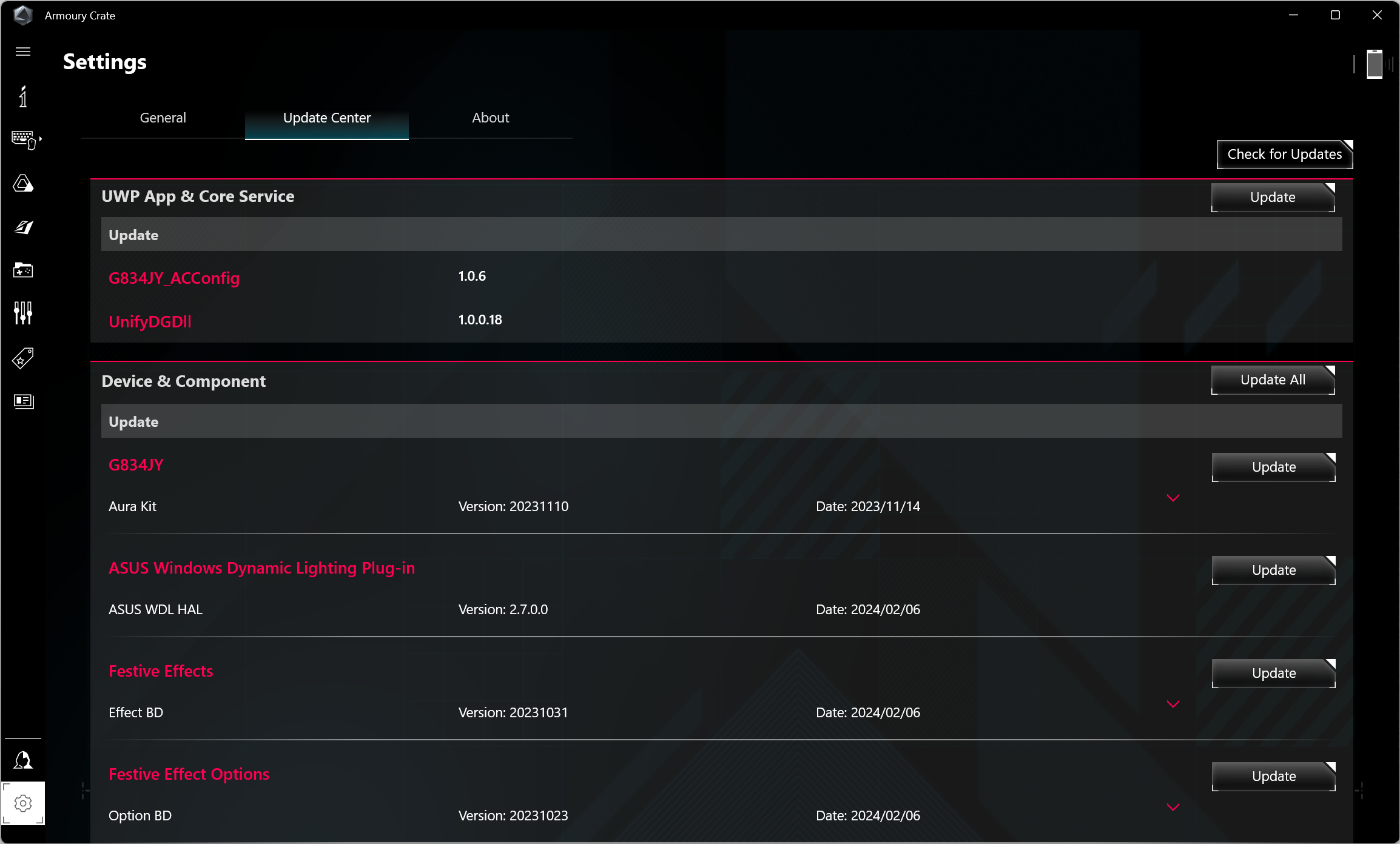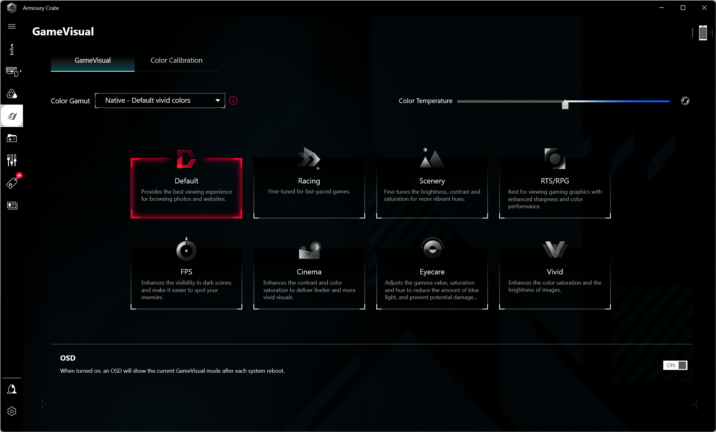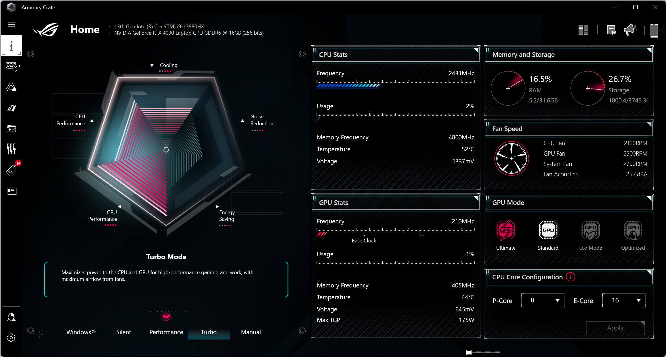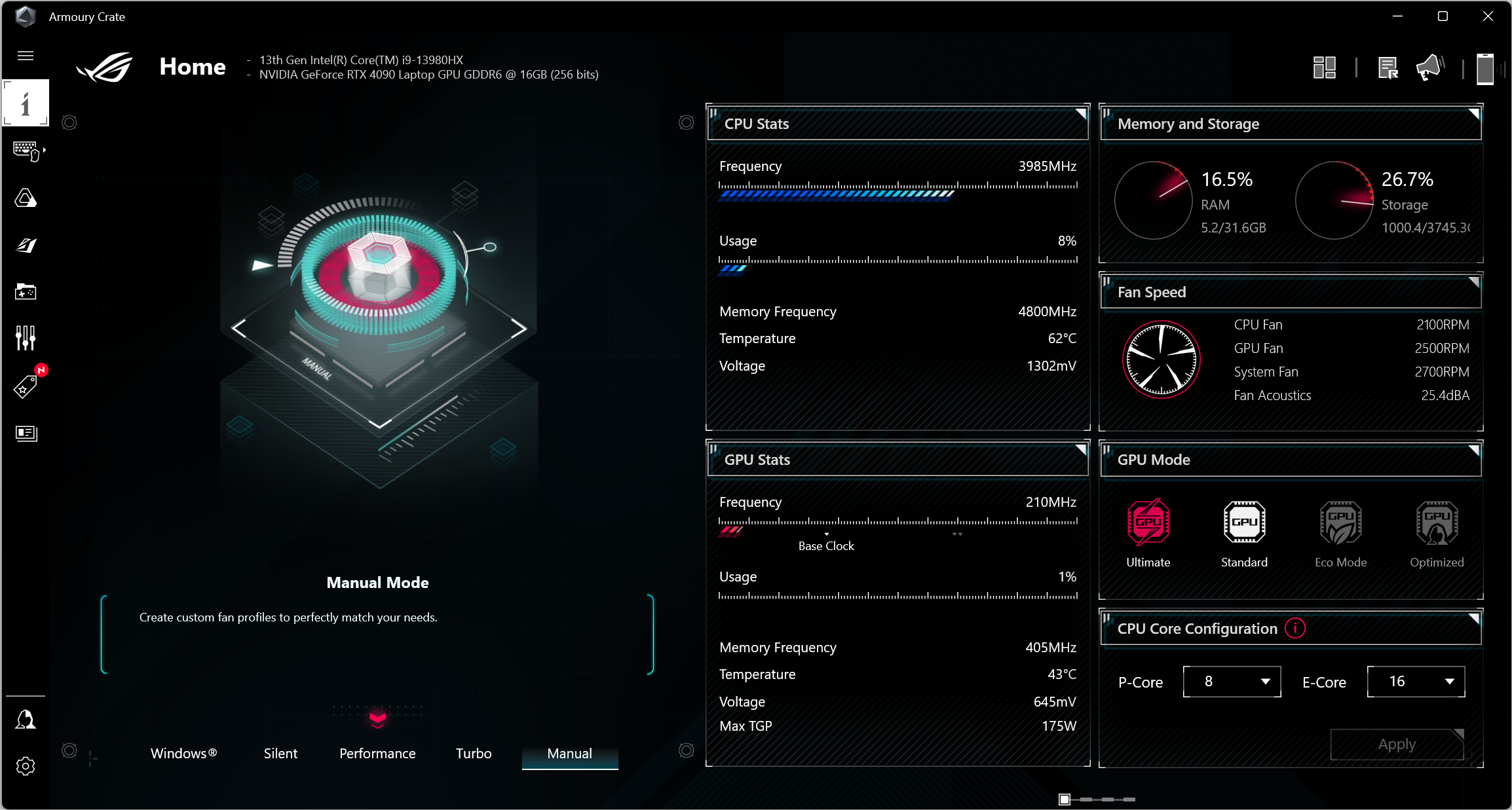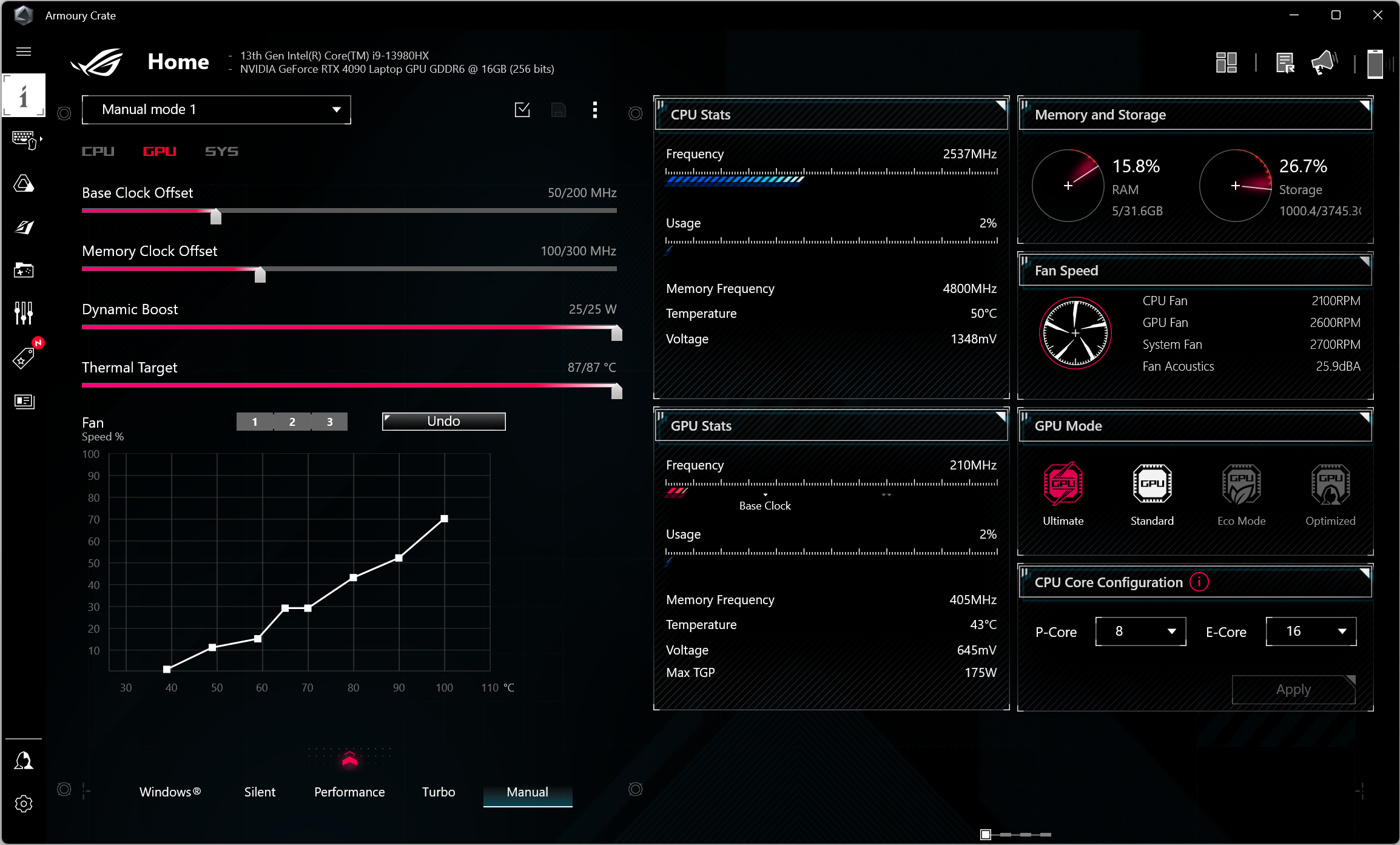 Asus ROG Strix Scar 18 G834JY был доставлен в нашу тестовую лабораторию с установленной ОС Windows 11 Home, триал-версией Microsoft Office 365, сетап-инициатором Яндекс, приложением пользовательской поддержки MyAsus и фирменной утилитой Armour Crate. Последняя дает возможность переключать сценарии (профили, пресеты) работы и получить сведения о скорости работы вентиляторов CPU и GPU, а также производимом ими шуме (в дБ).