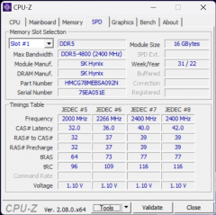 Модули ОЗУ DDR5-4800 по 16 ГБ каждый маркированы как SK hynix HMCG78MEBSA092N. Если заменить оба модуля на 32-гигабайтные, максимальный объем памяти составит 64 ГБ.