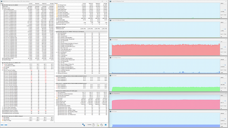 В испытаниях под максимальной нагрузкой потребление в турборежиме составило 205 Вт, что значительно выше паспортного предела (157 Вт), а в периоде стабилизации — 125 Вт, что опять-таки существенно — более чем вдвое — превышает предписания теплопакета (55 Вт).