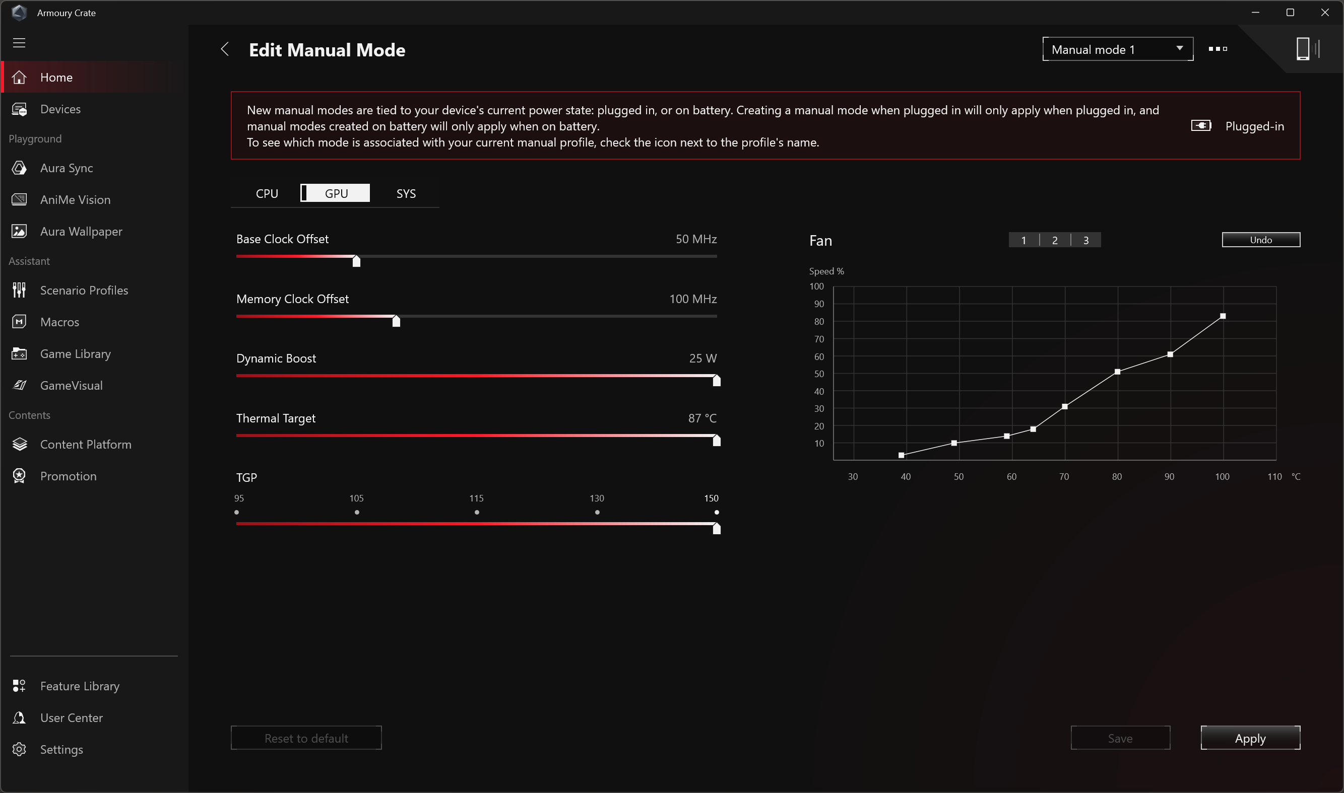 Asus ROG Strix Scar 18 G835LX прибыл к нам с установленной ОС Windows 11 Home, триал-версией Microsoft Office 365, сетап-инициатором Яндекс, приложением пользовательской поддержки MyAsus и фирменной утилитой Armour Crate. Последняя дает возможность переключать сценарии (профили, пресеты) работы и получить сведения о скорости работы вентиляторов CPU, GPU и «системного», а также производимом ими шуме (в дБ).