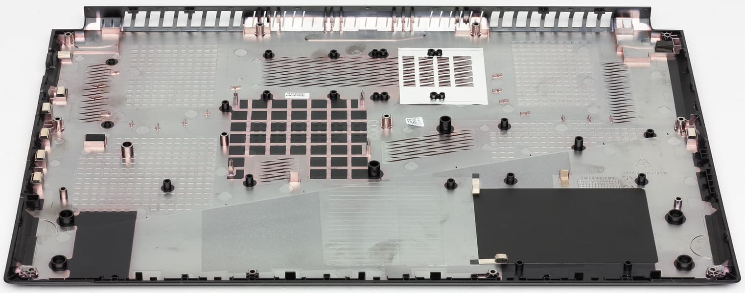 На нижней панели корпуса, которая выполнена из черного пластика с рельефной отделкой, есть вентиляционные отверстия. Прорезиненные ножки обеспечивают устойчивое положение ноутбука на горизонтальной поверхности.
