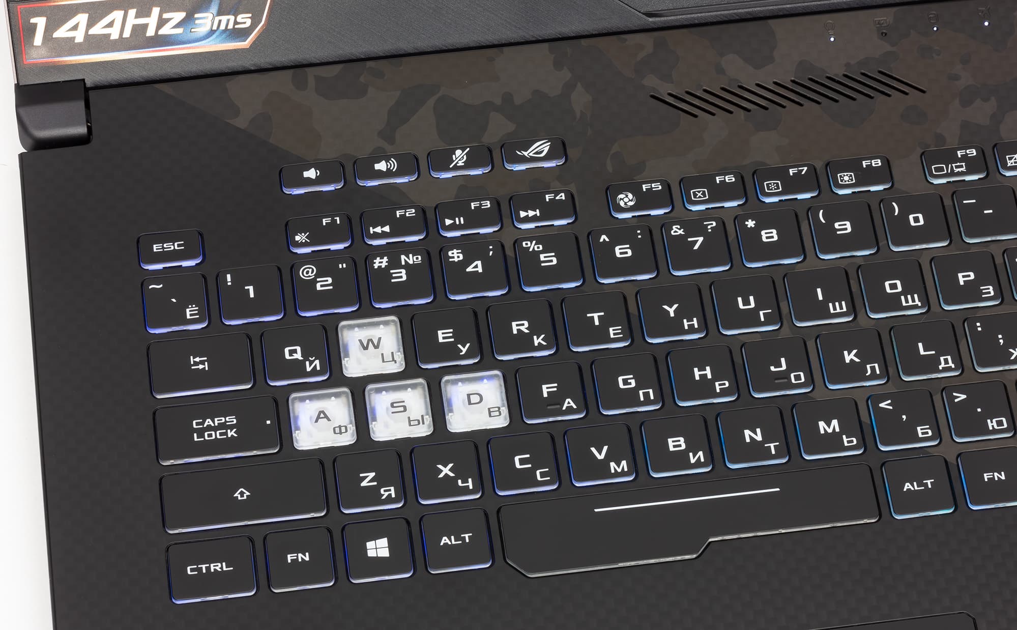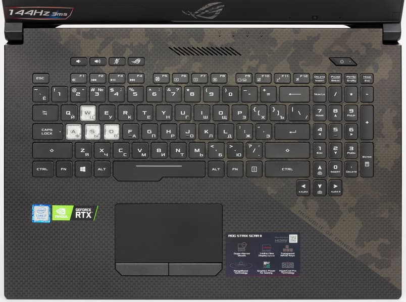 Поскольку данный ноутбук ориентирован на игры, здесь выделена зона игровых клавиш WASD: у этих клавиш полупрозрачные колпачки, а основание — белого цвета (соответственно, символы на этих клавишах темные).
