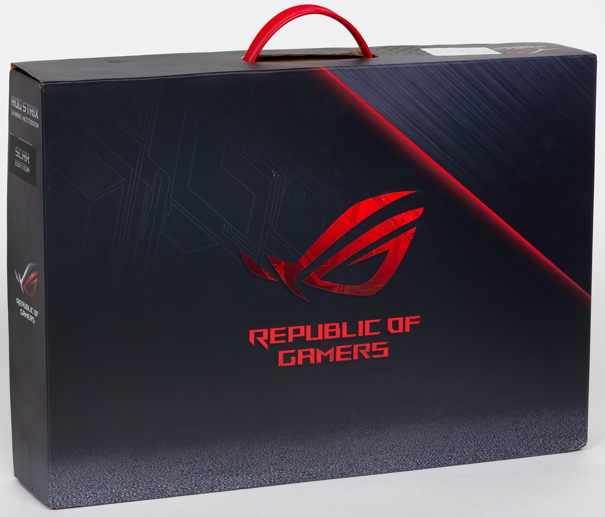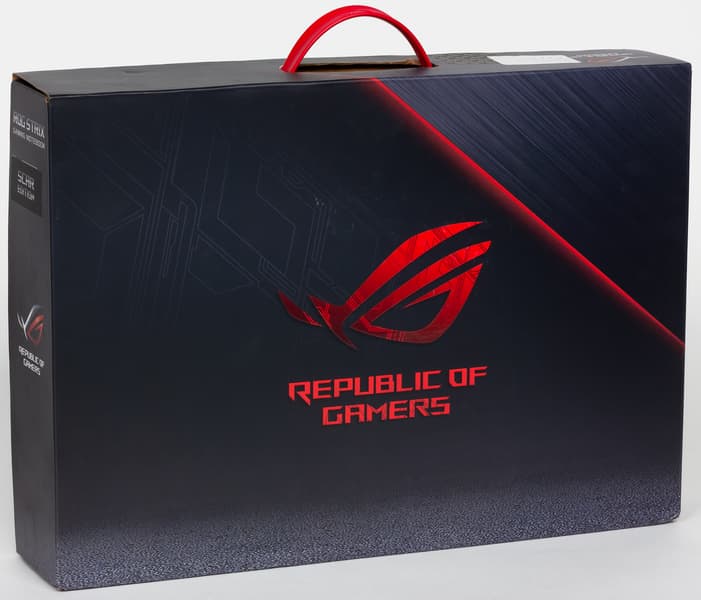Ноутбук Asus ROG Strix Scar II GL704GV поставляется в небольшой картонной коробке с ручкой.