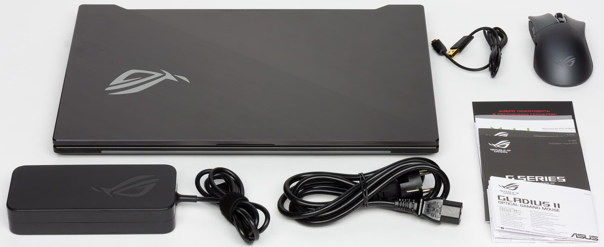 Кроме самого ноутбука в комплект поставки входит краткое руководство пользователя, гарантийный талон, адаптер питания мощностью 230 Вт (19,5 В; 11,8 A) и игровая мышка.
