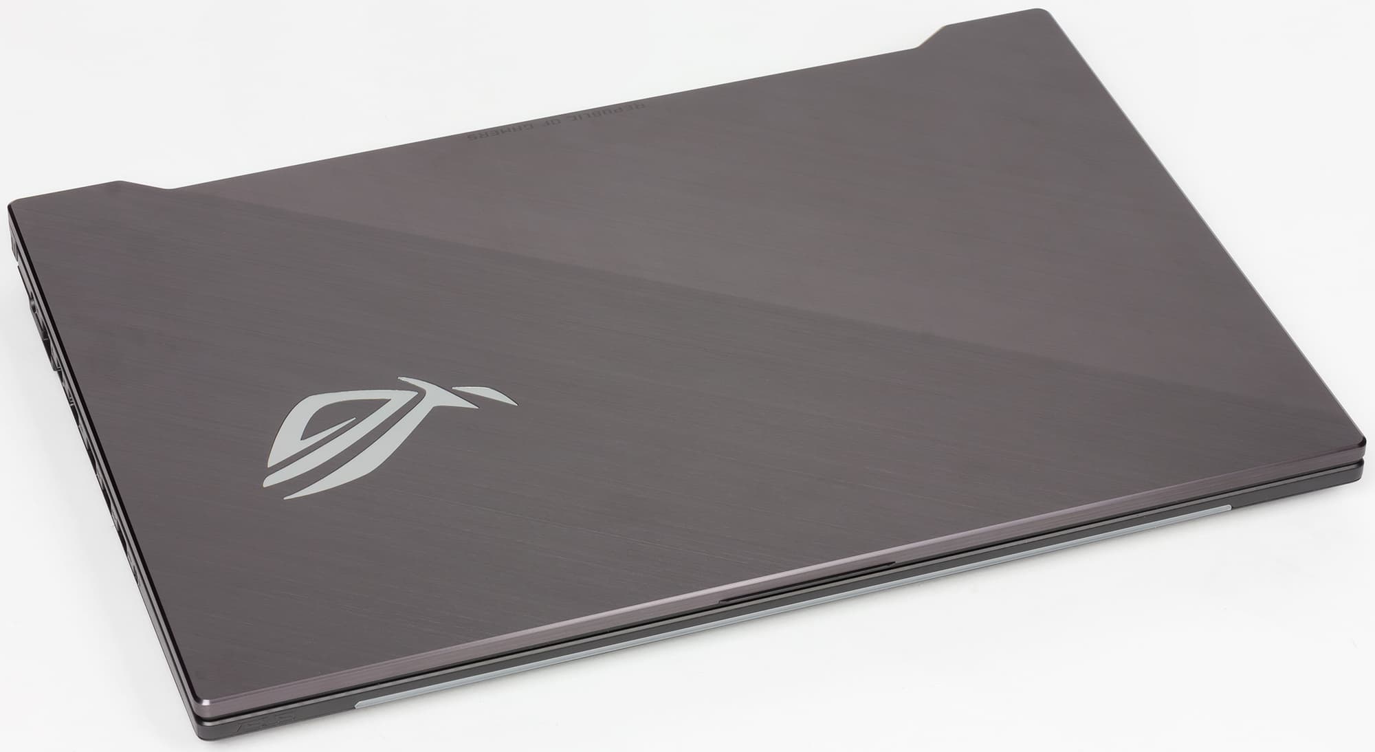 Толщина рамки вокруг экрана с боков и сверху — всего 7 мм, поэтому веб-камера и микрофоны расположены на нижней части рамки экрана. Тут же расположен и зеркальный логотип серии ROG.