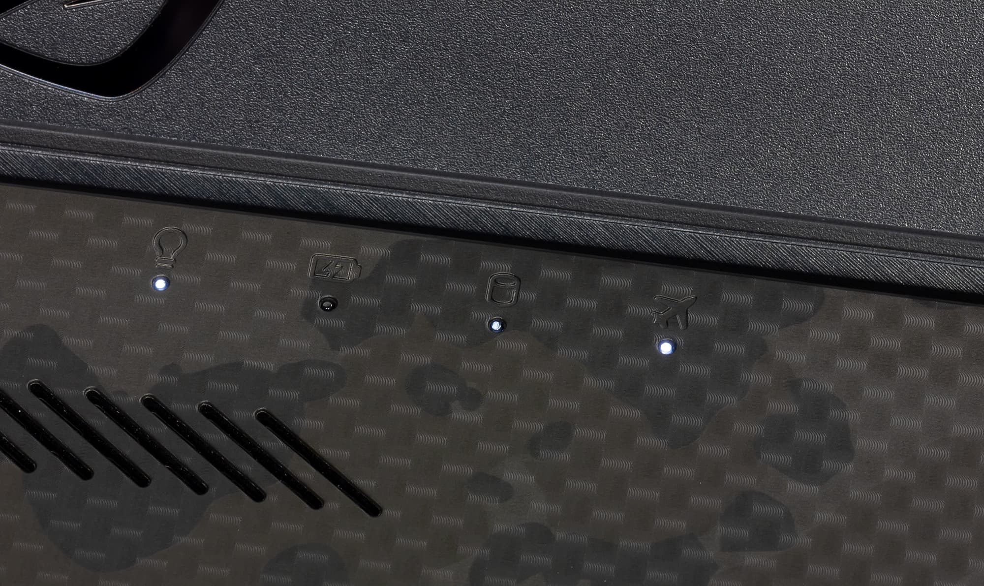 В левом углу рабочей поверхности, над клавиатурой, есть четыре отдельные клавиши управления ноутбуком: клавиша с эмблемой ROG, предназначенная для запуска фирменного приложения Armoury Crate, клавиша включения/отключения микрофона и две клавиши управления громкостью звука.