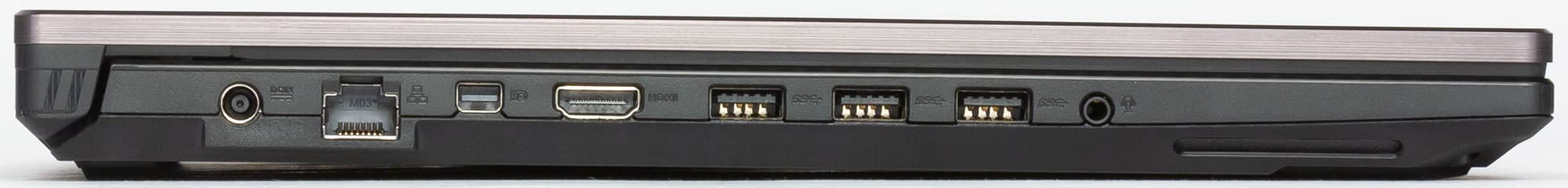 На левом торце корпуса расположены три порта USB 3.0 (Type-A), разъем HDMI, разъем Mini-DisplayPort, разъем RJ-45 и комбинированный аудиоразъем типа миниджек. Кроме того, тут же расположен разъем питания.
