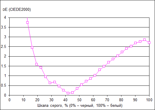 Что касается точности цветопередачи (дельта E), то ее значение не превосходит 3 по всей шкале серого (темные области можно не учитывать), это отличный результат для данного класса экранов.