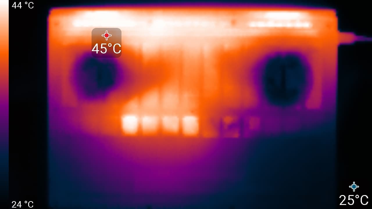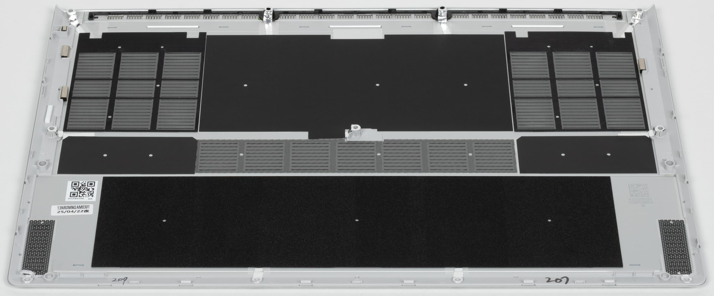 Задняя и передняя опоры протянулись почти во всю ширину. За задней имеются дополнительная решетка выходного тракта системы охлаждения. Входные решетки воздухозаборников располагаются почти на половине площади днища. У передней кромки справа и слева имеются решетки динамиков.