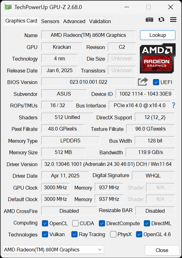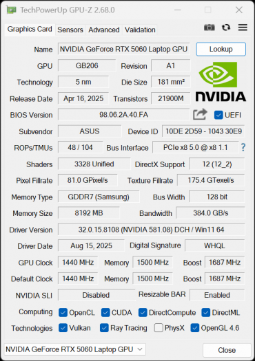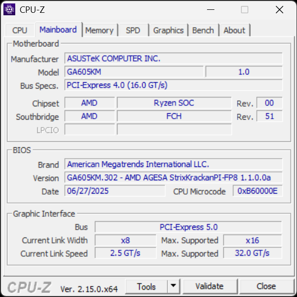 | Видеоподсистема | интегрированная: AMD c Graphics 860M (8 исп. блоков, до 3 ГГц, до 35 Вт) дискретная: Nvidia GeForce RTX 5060 Laptop с 8 ГБ GDDR7 (до 2,5 ГГц, 100 Вт) | |