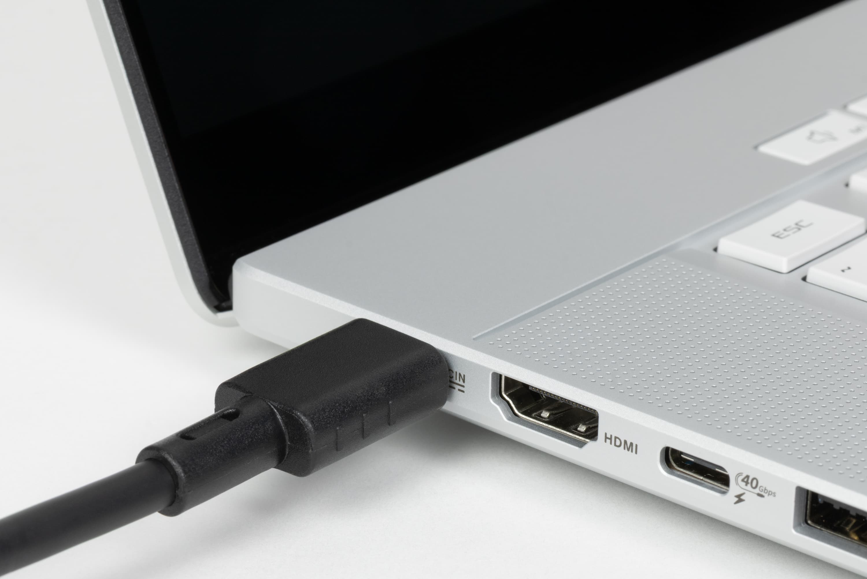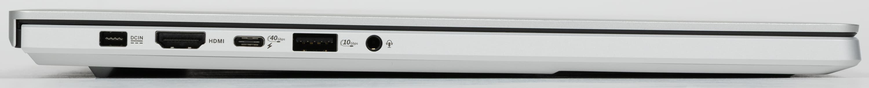 На левой боковой панели имеются проприетарный разъем для подключения блока питания, видеовыход HDMI, порты USB 4 (с поддержкой DP и PD) и USB 3.2 Gen2 (10 Гбит/с) и миниджек для аудиогарнитуры.