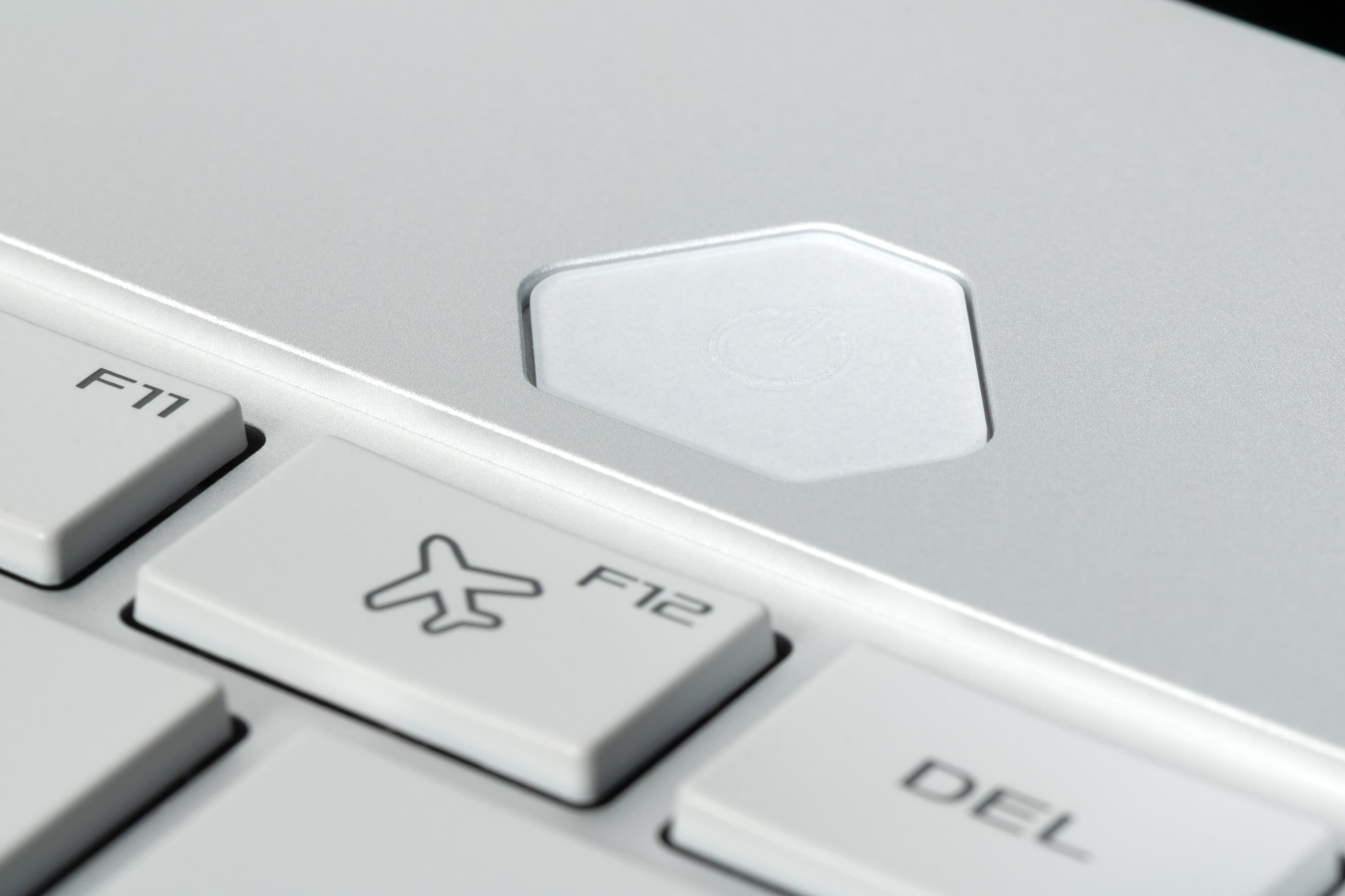 Кнопка включения питания располагается в дальнем углу клавиатуры и отличается от окружающих формой, местоположением, маркировкой и даже материалом изготовления (стекло). К тому же она утоплена ниже поверхности лицевой панели, поэтому перепутать ее с другими и нажать по ошибке совершенно невозможно.