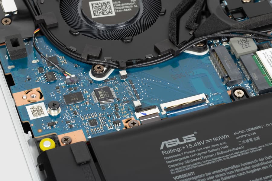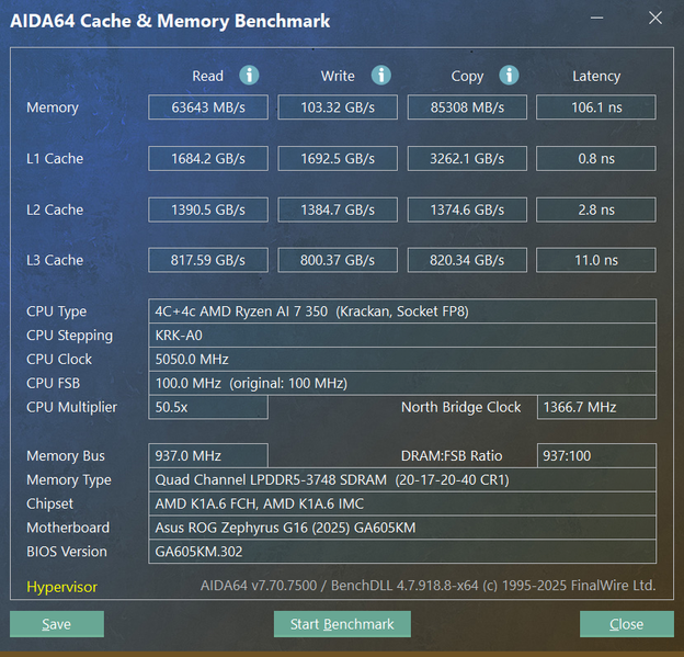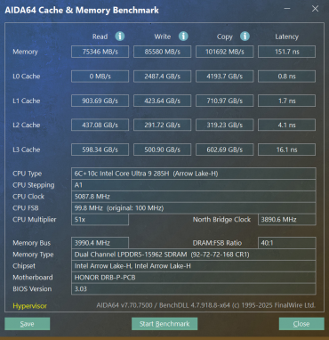 Внутри по размерам доминируют система охлаждения и аккумулятор.Аппаратная модернизация предусматривает возможность добавления дополнительного накопителя в свободный слот M.2, а также замену аккумулятора. Оперативная память распаяна. Уточним ее скоростные показатели при помощи пакета AIDA64.