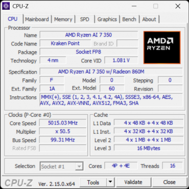 | Процессор | AMD Ryzen AI 7 350 (Krackan Point): 8 двухпотоковых ядер 2/3,5 ГГц (Turbo 5 ГГц); TDP 15—54 Вт (28 Вт), Tjmax 100 °C; нейронный блок AMD XDNA NPU, 50 TOPS | |
