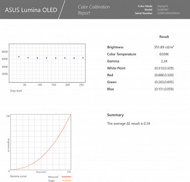 В ноутбуке используется 16-дюймовая OLED-матрица с разрешением 2560×1600 пикселей (отчет edid-decode). Для экрана обещаны соответствие критериям VESA Certified Display HDR True Black 500 и цветовой охват 100% пространства DCI-P3. Лицевая поверхность экрана изготовлена из стеклянной пластины, устойчивой к появлению царапин. Экран снаружи зеркально-гладкий. На внешней поверхности экрана есть специальное олеофобное (жироотталкивающее) покрытие, которое по эффективности заметно лучше, чем у экрана планшета Google Nexus 7 (2013) (далее просто Nexus 7), поэтому следы от пальцев удаляются существенно легче, а появляются с меньшей скоростью, чем в случае обычного стекла. Экран не сенсорный. Есть улучшенные антибликовые свойства, значительно снижающие яркость отраженных объектов, поэтому по антибликовым свойствам экран этого ноутбука гораздо лучше экрана Nexus 7.