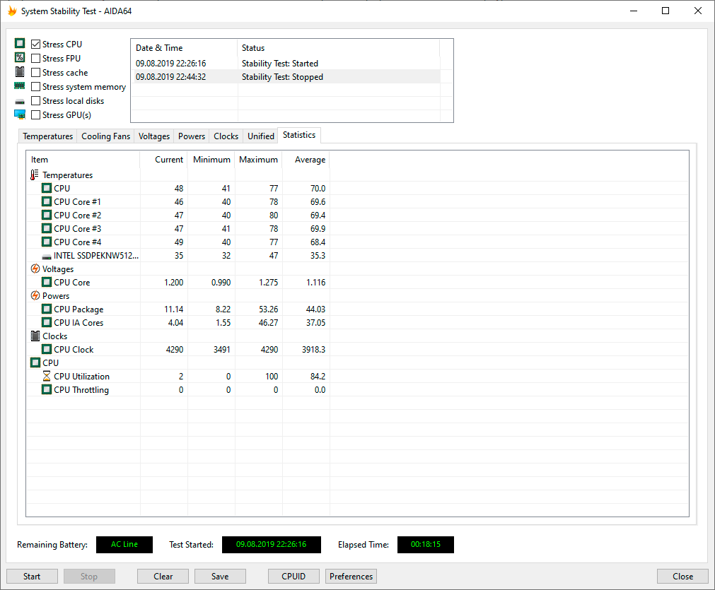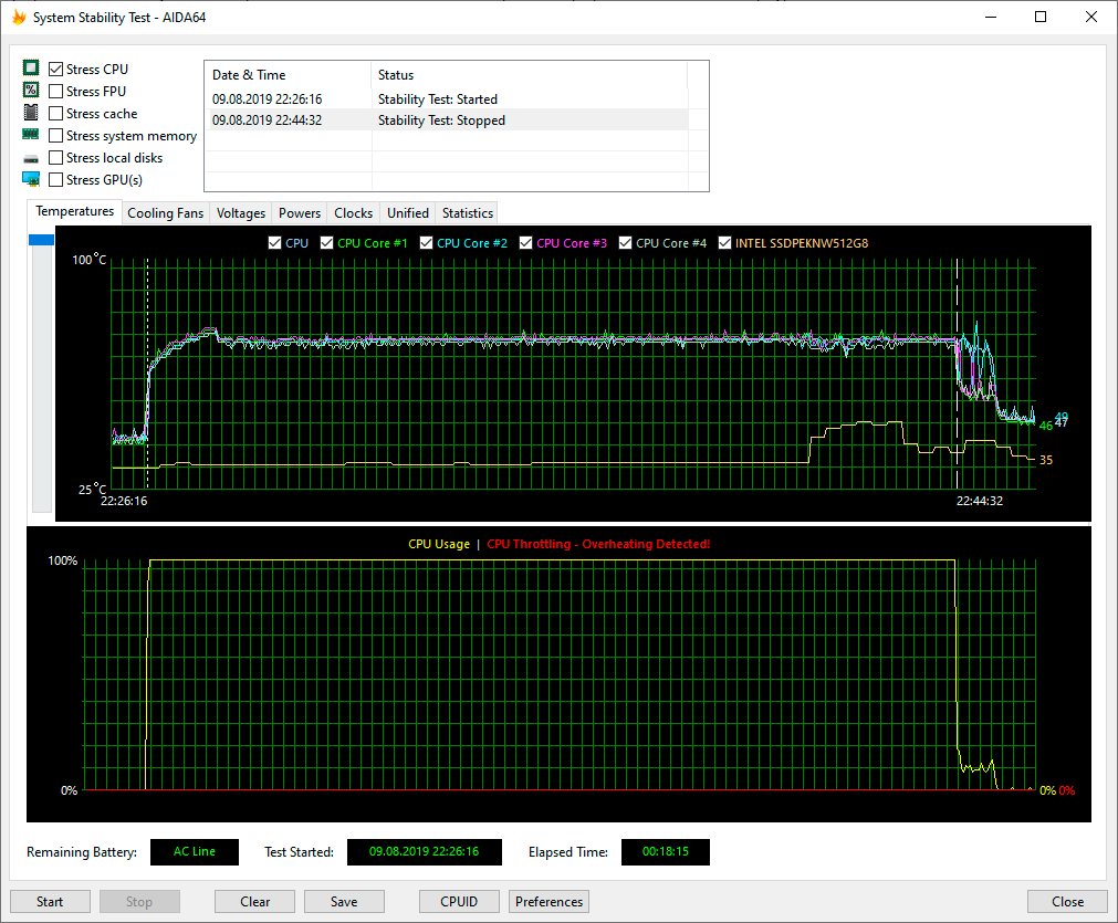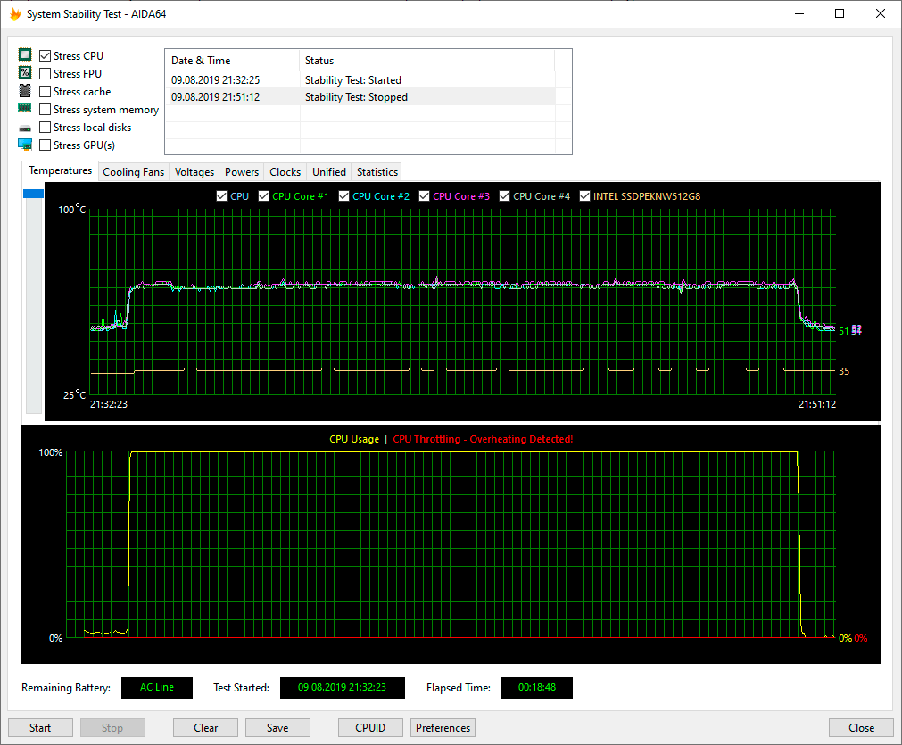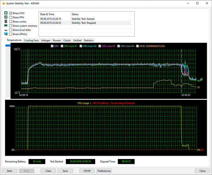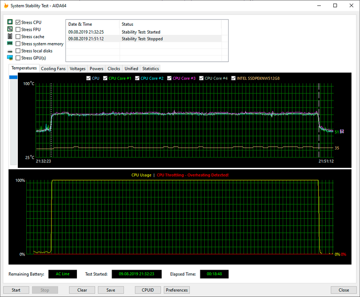 Для тестирования процессора мы использовали стресс-тест CPU из программы AIDA64 Extreme. Все тесты проводились под управлением операционной системы Windows 10 Pro x64 с установкой последних доступных драйверов и обновлений. Температура в помещении во время тестирования находилась у отметки 24 °C. Сначала посмотрим на работу ноутбука при подключении к электросети.