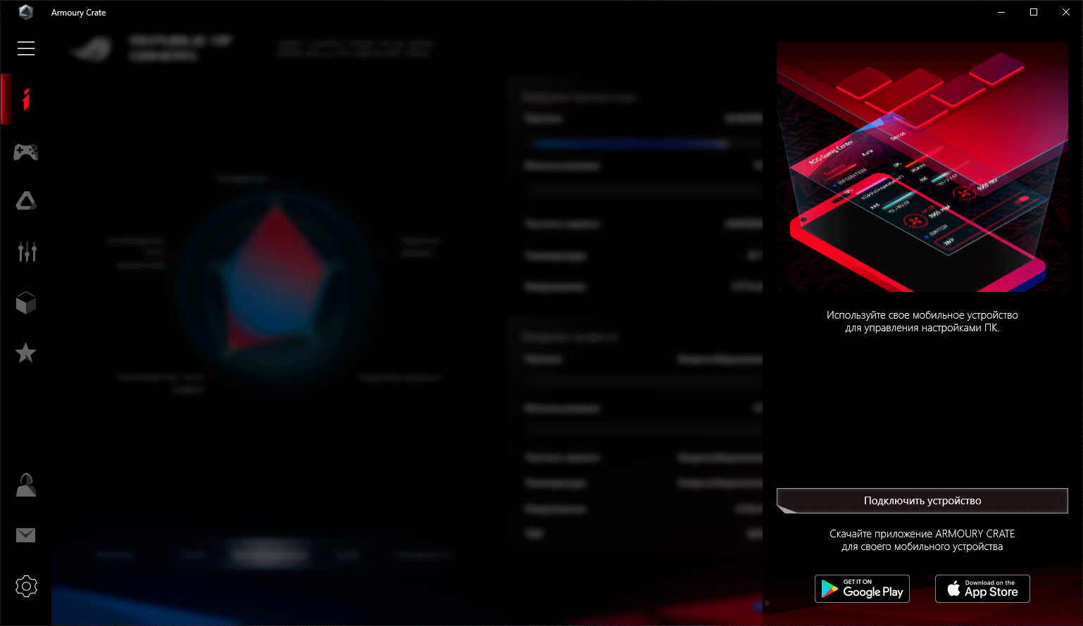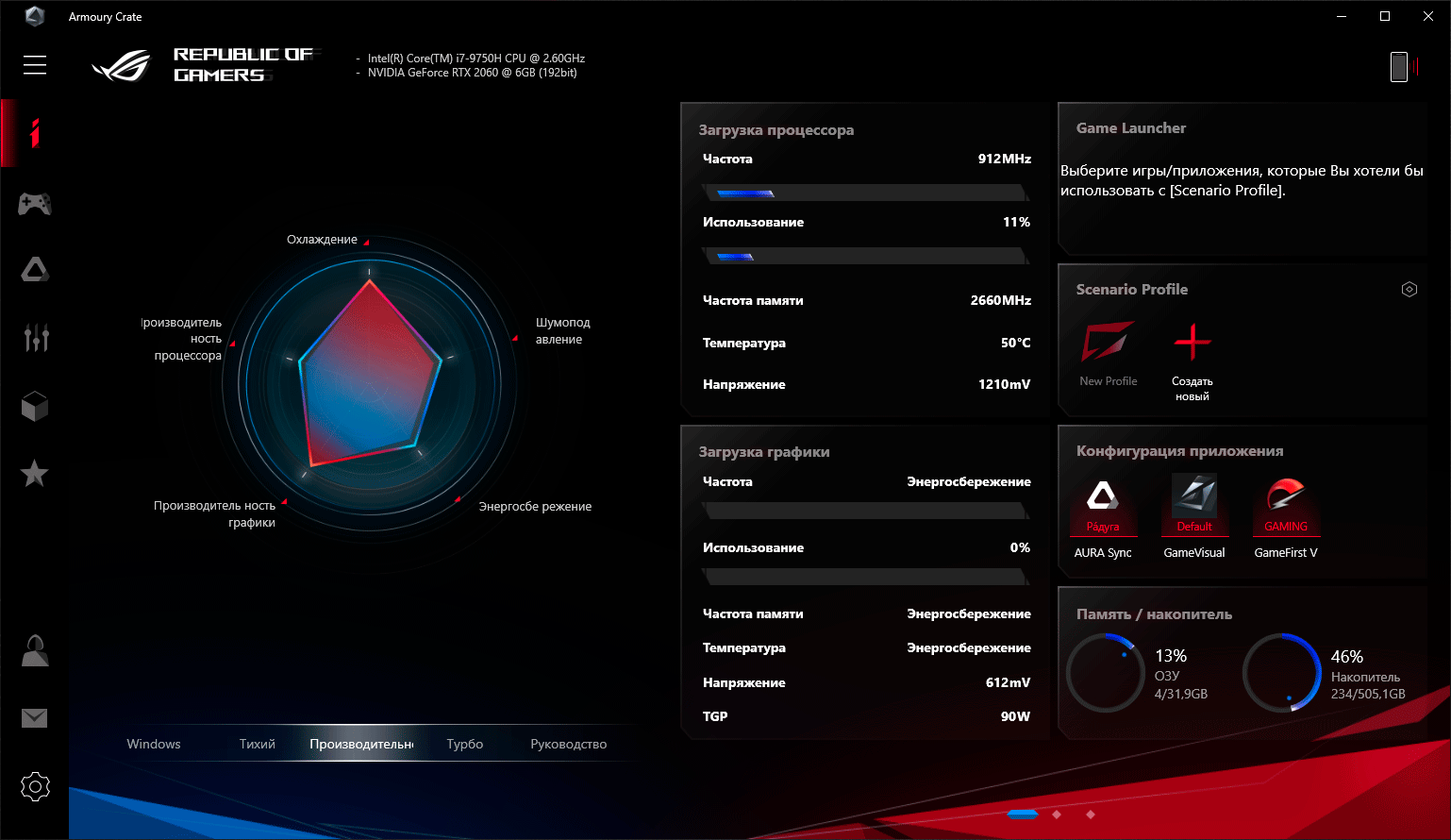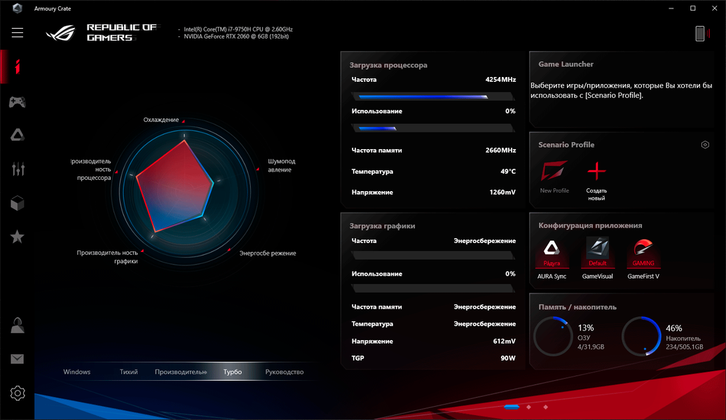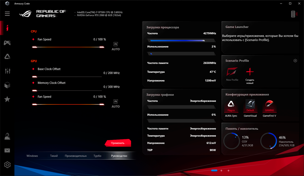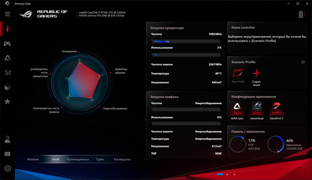 Для управления ноутбуком Asus ROG Zephyrus S GX502 из-под Windows 10 или через мобильное приложение можно установить программный комплекс ROG Armoury Crate. Он представляет собой многофункциональный комбайн, состоящий из нескольких подразделов для настройки и последующей активации различных режимов работы компонентов ноутбука, настройки подсветки клавиатуры Aura Core, конфигурирования быстрых клавиш доступа к различным функциям и быстрого доступа к другим приложениям Asus и компаний-партнеров.