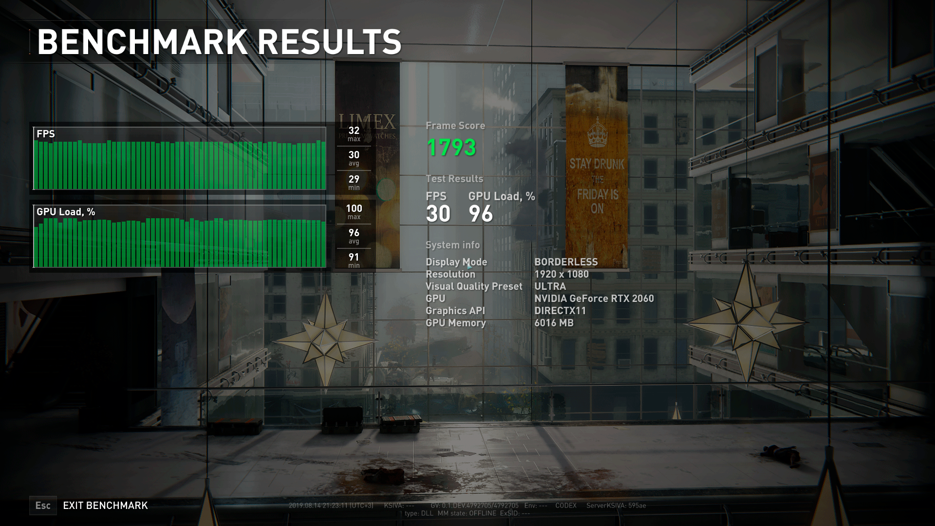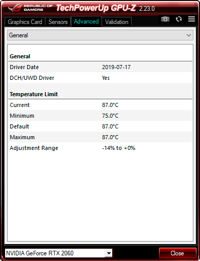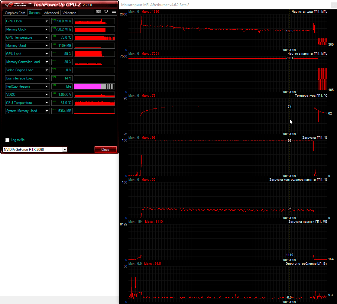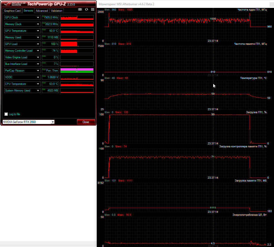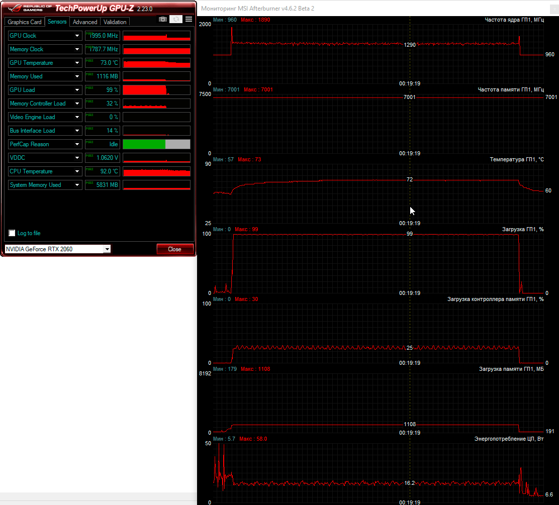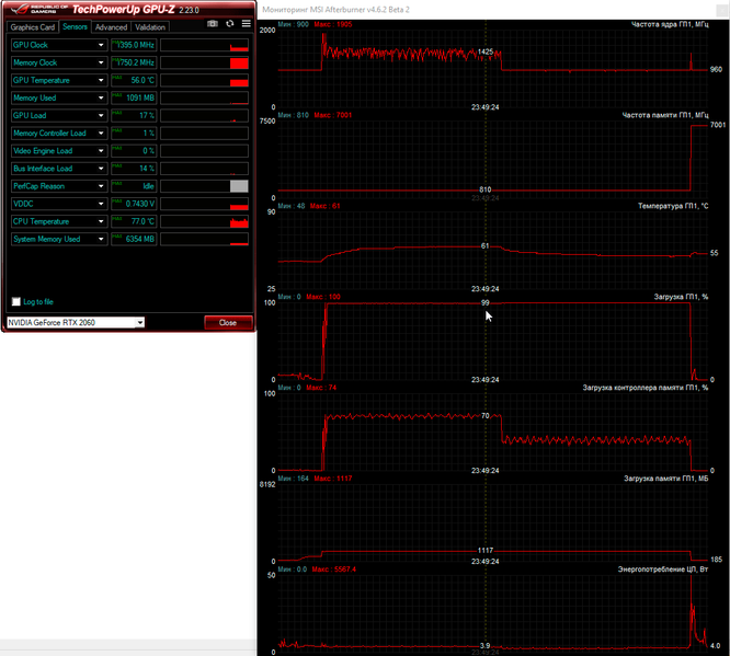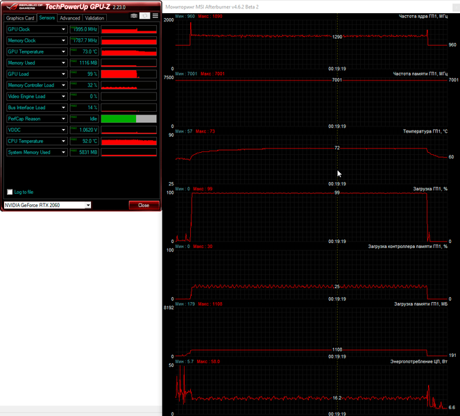 Комфортно поиграть в любые современные игры в родном для ноутбука Asus разрешении 1920×1080 пикселей поможет видеокарта Nvidia GeForce RTX 2060 с шестью гигабайтами видеопамяти типа GDDR6. Базовая частота графического ядра этой модели ноутбучной видеокарты снижена до 1060 МГц с форсажем до 1300 МГц против 1365 и 1680 МГц соответственно у десктопной модели. На практике мы получили другие частоты, но об этом чуть ниже.