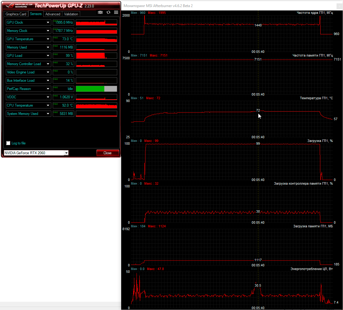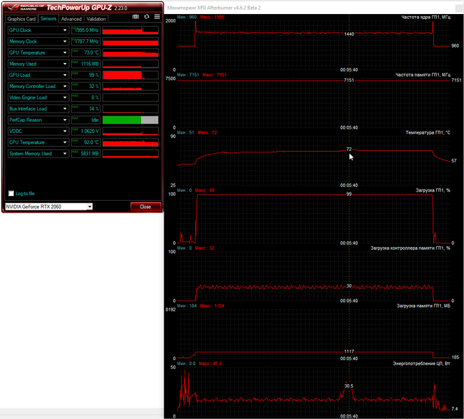 В тихом режиме частота графического процессора мобильной GeForce RTX 2060 держится у отметки 1,3 ГГц при температуре 72 °C. Турбо-режим позволяет GPU работать на частоте около 1,45 ГГц при той же температуре, но с более высоким уровнем шума. Однако сильнее двух других удивил режим «Сбалансированный», в котором, казалось бы, видеокарта должна работать на более высоких, чем в тихом режиме, частотах, но на практике частота GPU в конечном итоге едва превысила 1,05 ГГц, а температура увеличилась до 74 °C. Особо обращаем внимание, что тестовые условия были идентичными во всех трех испытаниях, но именно сбалансированный профиль настроек ноутбука при питании от электросети оказался наиболее противоречивым и алогичным. Частота видеопамяти была одинаковой во всех трех случаях и составила 14 ГГц.
